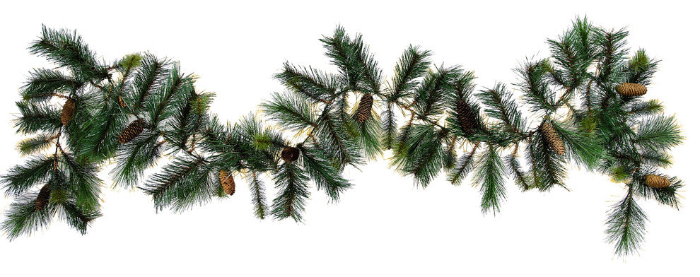 Luscious pine garland with 83 adjustable tips, decorated with natural pine cones. Dress it up anyways you want to. A perfect accent piece to display this over doors, windows, fireplace mantels, fence or stairway railings, in indoor or covered outdoor locations. Size 108"L x 14"D x 8"H. Dimensions based on image shown. Primping required to match on the image shown.
