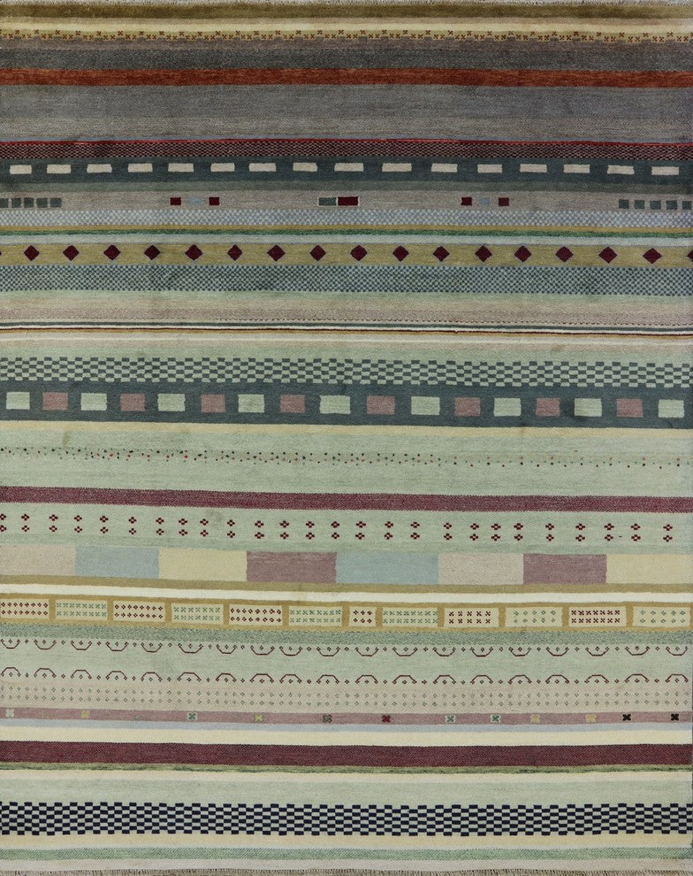 Gabbeh rugs are hand-spun wool in both the pile and the foundation, as well as all natural dyes. Simple, colorful geometric patterns, abstract scenery, child-like representations of people and animals, different colors, reds, blue, greens ,yellow, purple. Modern technology has improved the dye process to allow a wider range of colors as well as more stable and easier to care for colors.