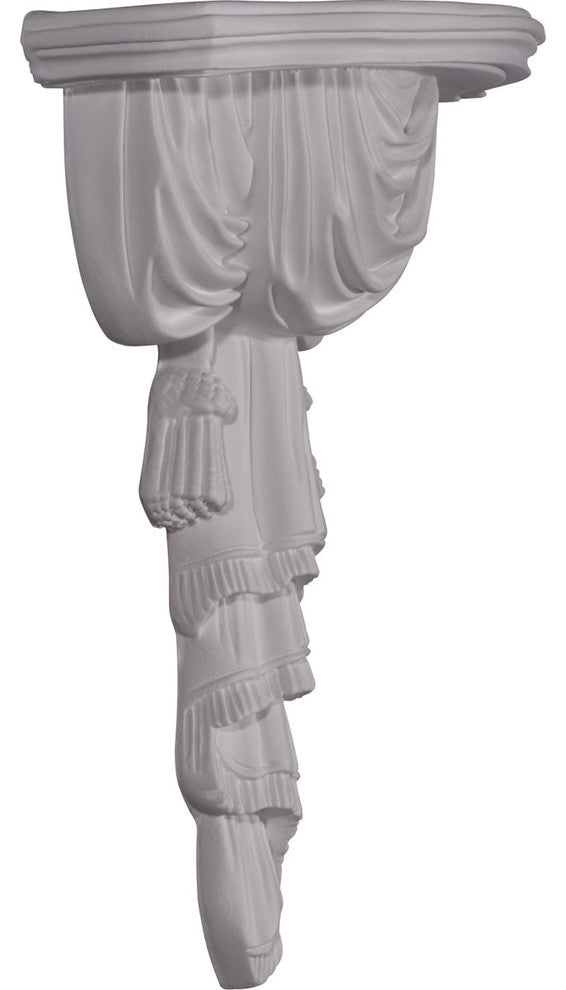 9 3/4"W x 4 1/2"D x 12 1/8"H Tassel and Ribbon Shelf. Theses shelves are truly unique in design and function. Primarily used in decorative applications urethane shelves can make a dramatic difference in kitchens, bathrooms, entryways, fireplace surrounds, and more. This material is also perfect for exterior applications. It will not rot or crack and is impervious to insect manifestations. It comes to you factory primed and ready for your paint, faux finish, gel stain, marbleizing and more. With these shelves, you are only limited by your imagination.