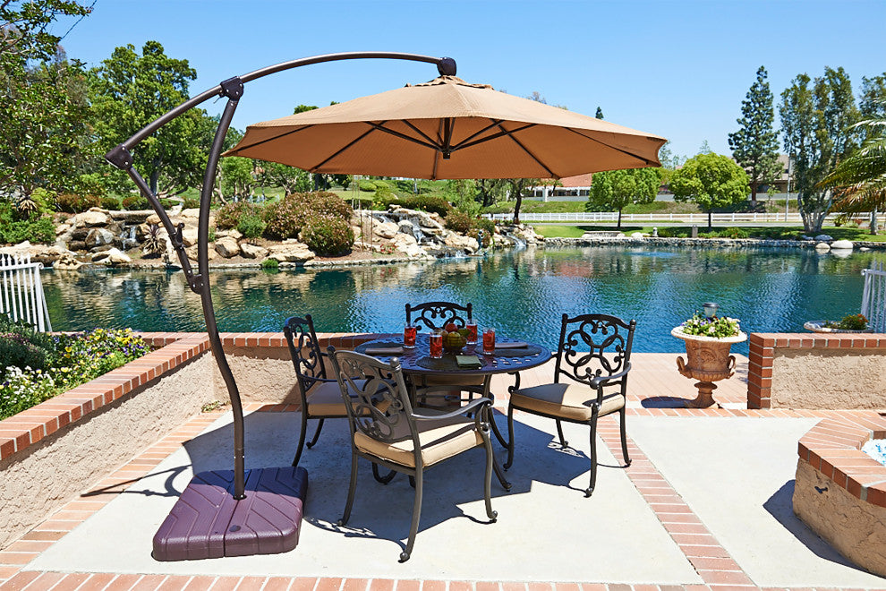 This California Umbrella cantilever is an exciting umbrella that opens up tremendous possibilities for any space. The large 9 foot canopy tilts and turns 360 degrees to offer the most dramatic shade potential. With a strong 2 inch diameter aluminum pole, stainless steel crank system and a standard base with pre-drilled ground anchor holes; this tough design will stand up to the rigors of use. It is recommended to use at least 100 lbs. of weight on the base if the frame is not anchored to the ground. This umbrella also features Pacifica fabric, a solution-dyed polyester fabric that has been designed and perfected by California Umbrella for the use with our quality made umbrellas.