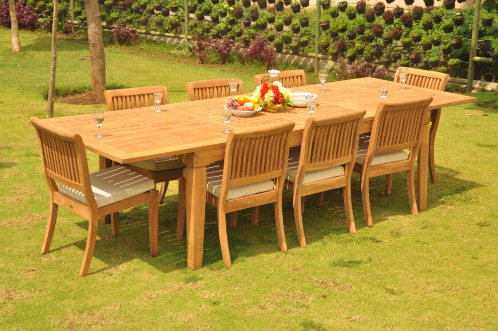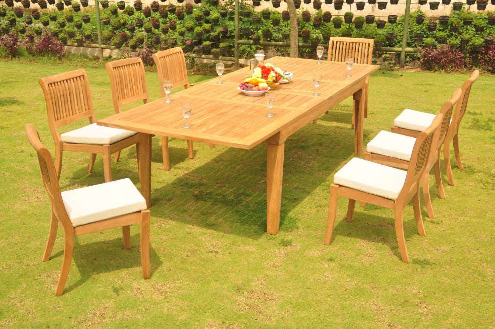 9-Piece Teak Dining Set: 122" Rectangle Extn Table, 8 Arbor Stacking Arm Chairs