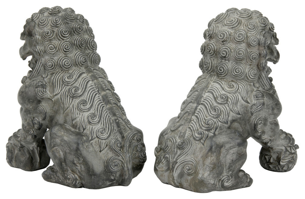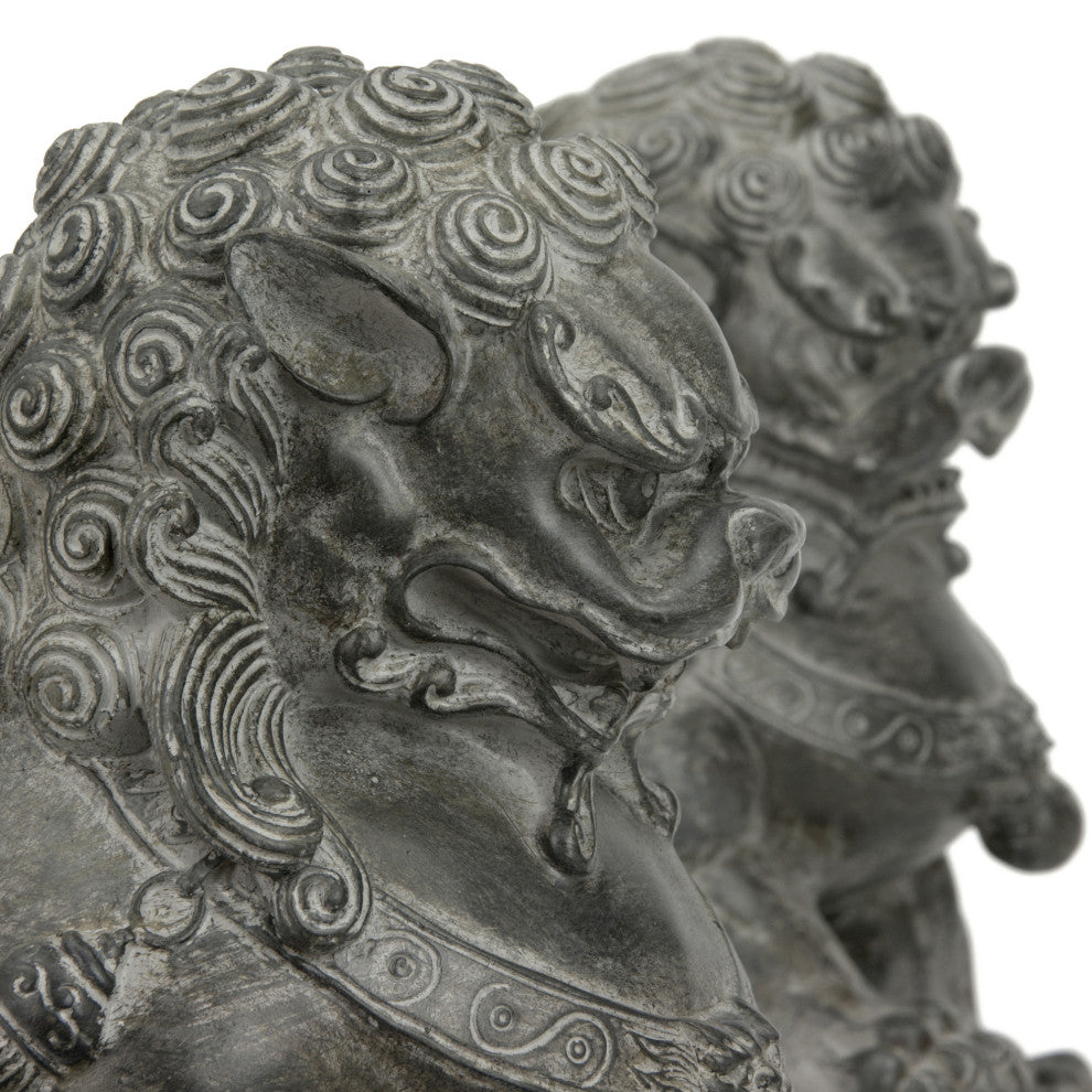 These highly detailed reproductions of an authentic pair of Chinese statues are the perfect size for display on a table or bookshelf. Often called "Foo Dogs" in the West, these statues actually represent guardian lions and were traditionally placed on either side of an entry doorway to protect the occupants within. The powerful male lion rests his paw on top of an orb symbolizing the world while his nurturing female companion gently holds a playful cub.Detailed resin reproduction of classic Chinese statuesWeathered finish looks just like ancient stoneSmall size is ideal for display on a table, mantle, or bookshelfA traditional gift for holidays, birthdays, housewarmings, or new business partnerships