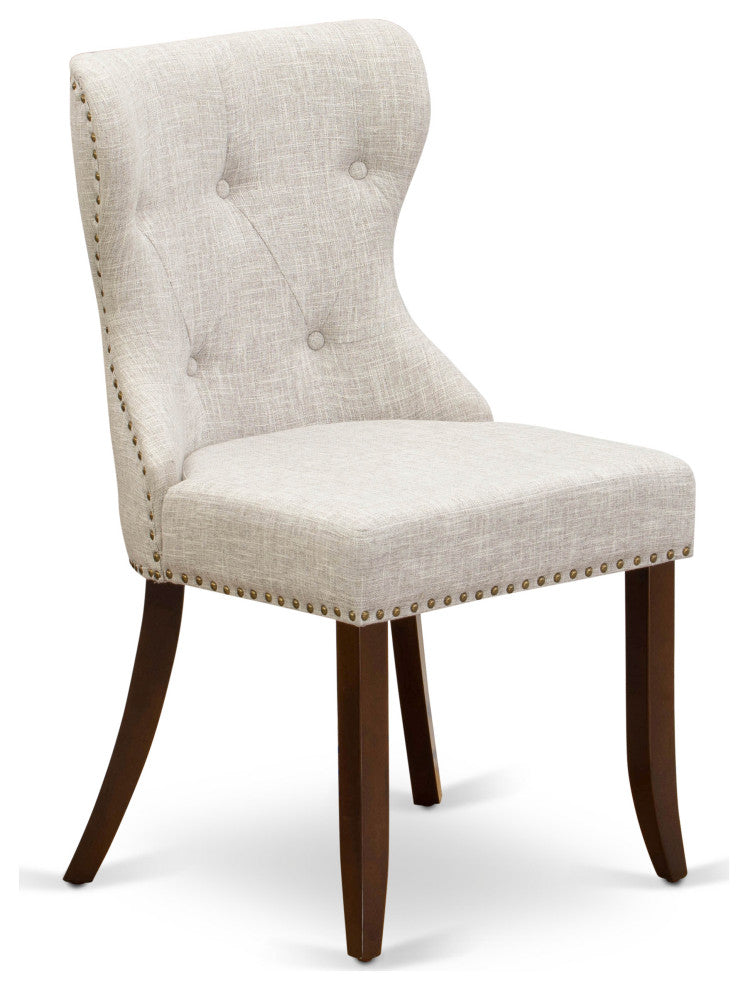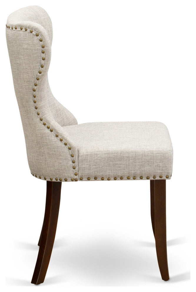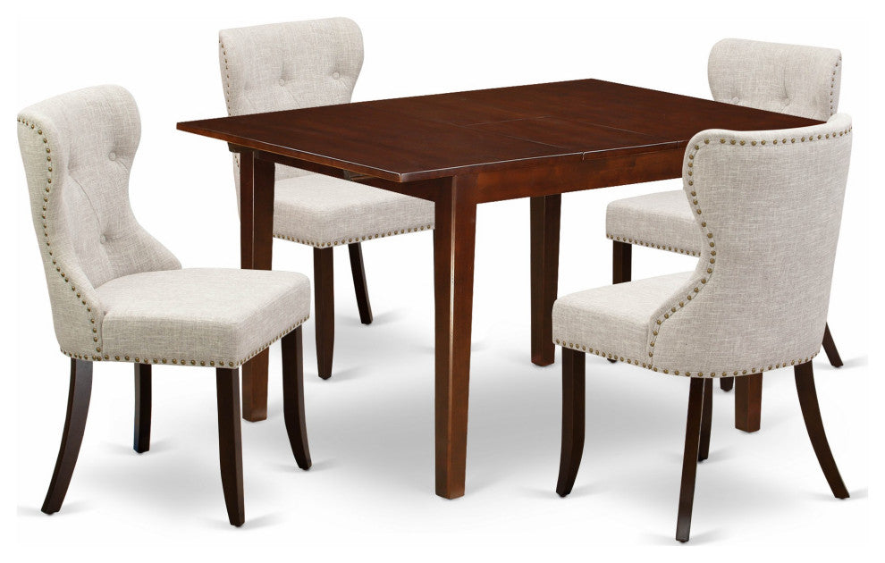 This outstanding two-side 12 butterfly leaf rectangle dining table can bring the remarkable impression of the dining style to both typical and fashionable decoration. This kitchen table set will deliver a excellent dose of charm to your dining-room. The beautiful five-piece traditional dining table set emphasizes its curves and details, giving an otherwise traditional set a little modern twist. The body of these unique kitchen dining chairs and wood kitchen table is produced from Premium Quality Asian wood (Rubber Wood) which gives fantastic sturdiness and stability to these indoor dining chairs and wood kitchen table. Modern sturdy hardwood structure, comfortable upholstered seat, and stylish back, reliable two-side 12 butterfly leaf rectangle wooden table offer innovative eyes to your kitchen, great stability to this superb dining set, and comfortable support to your back. Because of the lightweight, this dining table set is a breeze to carry, clean, assemble and alter its places, classic styles of this special two-side 12 butterfly leaf rectangle wooden table meet perfectly with any home decor and a smooth oak wooden seat and stylish back of these dining chairs will keep users comfortable.• Offering a gorgeous dining set to improve the beauty of dining room with classy design. This modern dining table set includes 4 indoor dining chairs and a wonderful two-side 12" butterfly leaf rectangle wooden table that will enhance the attractiveness of every dining area with their timeless fashion.• This dining room table set capabilities cozy Linen Fabric Doeskin color, the structure of these parson dining chairs and the wonderful wooden dining table is built from high quality Mahogany finish wood, which produces the best choice quality color combination to give a magnificent gaze to your kitchen.• Dimensions of the gorgeous two-side 12" butterfly leaf rectangle dining table: Length 42/54 x Width 36 x Height 30Dimensions of the fabulous dining room chairs: Length 21.5 x Width 19.5 x Height 35.5• Chair Leg Wood Color: Mahogany• Chair Fabric Material: Linen Chair Fabric• Fabric Color: Doeskin• Rectangle kitchen table color: Mahogany• Dining chairs dimensions: Length 21.5 x Width 19.5 x Height 35.5• Modern dining table dimensions: Length 42/54 x Width 36 x Height 30• Package includes: 4 indoor dining chairs and a two-side 12 butterfly leaf rectangle wooden dining table