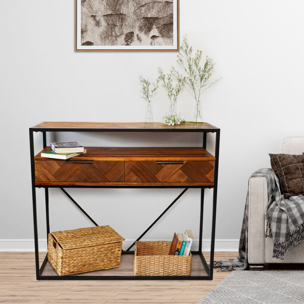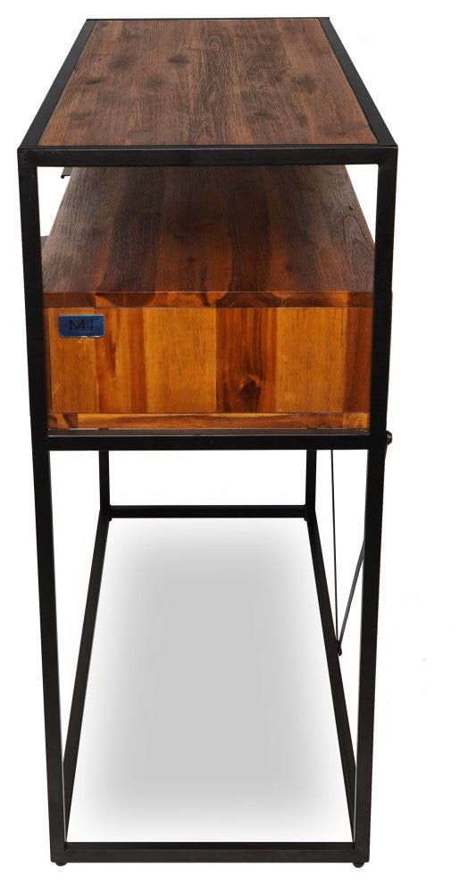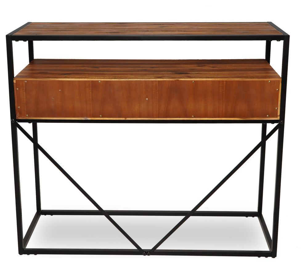 Discovering the vintage beauty of natural wooden furniture with our console table which is a perfect piece for any home. The steel frame is powder coated for anti-rust and longevity, while the dark brown color with vintage pattern design adds a touch of classic sophistication to your room. The sturdy acacia wood construction with pine veneer outside drawers provides ample storage space for your everyday essentials. Flawless for displaying your favorite decor or as a functional storage solution, this console table will make a statement in your home