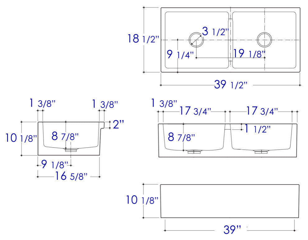 This sink is constructed of solid high-grade fireclay material using high pressure casting, ensuring durability, longevity, and resilience to acids, alkali''s, scratches, and chippingDesigned in Italy, Made in ItalyExterior Dimensions : 39 1/2" x 18 1/2" x 10 1/8"Inner Bowl Sizes : 17 3/4" x 15 3/4" x 8 7/8" ; 17 3/4" x 15 3/4" x 8 7/8"Non ReversibleCapable of being installed via Under-Mount (countertop Over edge of sink), Top-Mount (countertop Under edge of sink), or Flush-Mount (countertop Even with sink)Bottom Width : 39" Top Width : 39 1/2" . This sink tapers from top to bottom by 1/2"Double bowl sink, giving you added flexibility to do tasks such as soaking dishes on one side while still having a usable sink on the other sidePossesses Extra-Thick fireclay walls of 1 3/8"Due to the organic nature of the fireclay, material dimensions may vary by 1/8" of an inch. We recommend having the sink on location to trace and measure for countertop and cabinet cut outs.