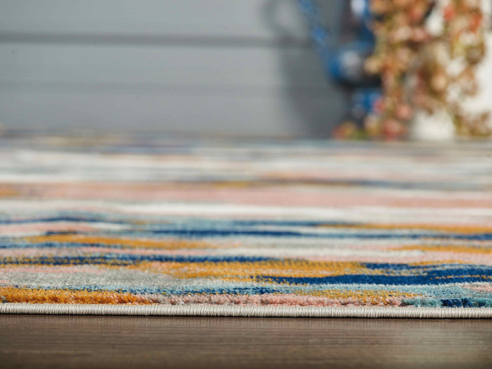 This contemporary rug is a fun blast from the past. Invite the retro charm of the 1960s with its abstract, linear style. Featuring the best of mid-century modern style, this lined splattered area rug is an artful display of strong orange, blue, and even dark pink lines, interwoven and interlocked together with light distressing like threads woven with a needle. This style is abstract enough to complement any clean-lined furniture or modern interior decor. By mixing muted colors of our current design era with gorgeous styles of the past, this will quickly become the centerpiece in any room of your home. Style: ContemporaryCollection: Porto Material: PolypropyleneWeave: Machine MadeOrigin: TurkeyColors: Ivory, Silver, Light Blue, Navy, Burnt OrangeAvailable sizes: 3"™ x 5"™, 4"™x 6"™, 5"™3 x 7"™6"?, 6"™ x 9"™, 7"™9" x 10"™2"Care: Easy to clean, stain resistant, does not shed