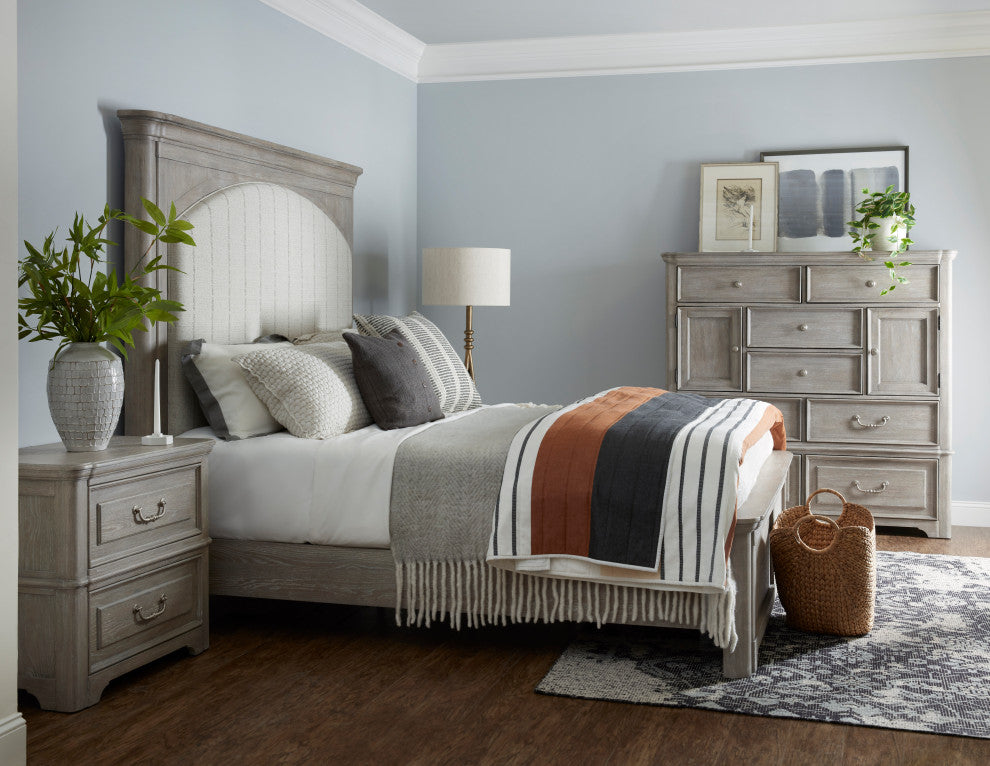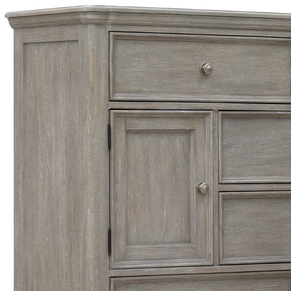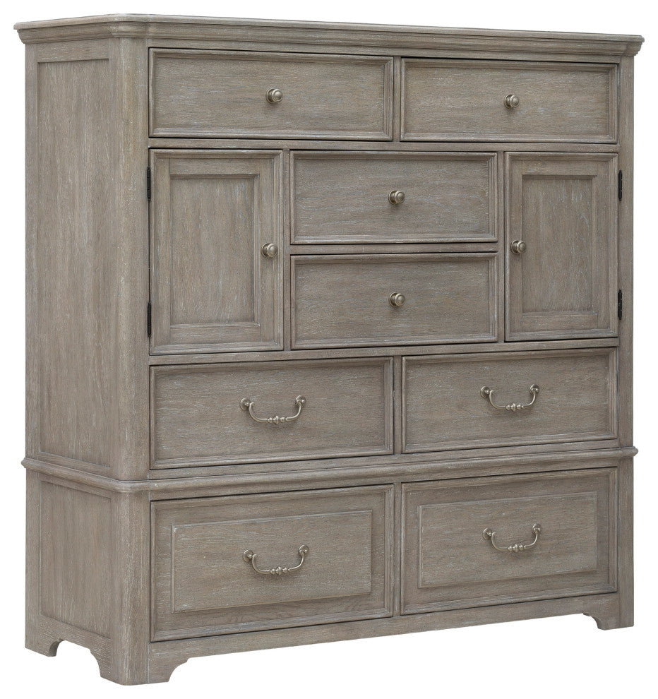 This exquisite Abbotts Glen Master Chest combines exceptional functionality with refined design. Featuring eight spacious drawers and two door cabinets, it provides versatile storage for all bedroom essentials. The cut-out plinth base, proudly extending beneath the pilasters, adds a touch of architectural elegance, while the soft corners lend a sophisticated yet inviting feel. Bold perimeter moldings and a Windmill Grey finish enhance the chest''s timeless charm. Inside, felt-lined top drawers safeguard delicate items, while cedar-lined bottom drawers protect textiles and maintain freshness. Crafted with ball-bearing drawer guides, dovetail construction, and dust bottoms, this chest offers durability and ease of use. Finished with custom bail pulls and knobs in soft pewter, this piece is a perfect blend of style and practicality for any master suite.