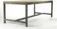 Dining table with weathered grey top on distressed grey metal legs with stretchers.