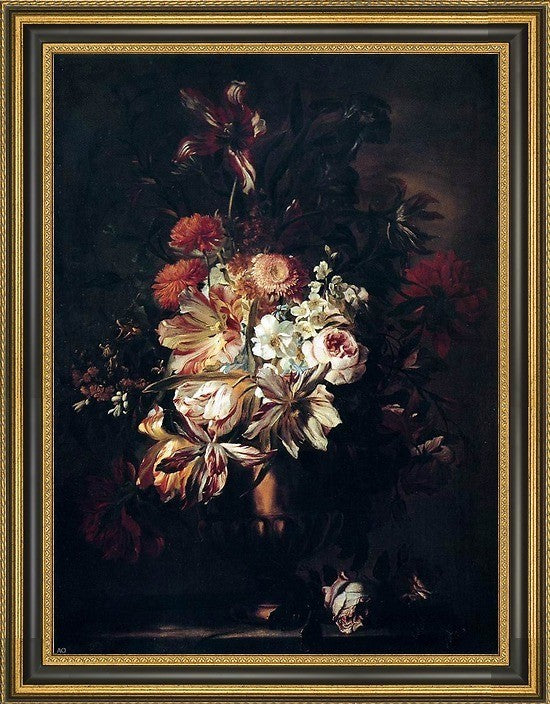 18" x 24" Abraham Brueghel Flowers in a Bronze Vase framed premium canvas print reproduced to meet museum quality standards. Our Museum quality canvas prints are produced using high-precision print technology for a more accurate reproduction printed on high quality canvas with fade-resistant, archival inks. Our progressive business model allows us to offer works of art to you at the best wholesale pricing, significantly less than art gallery prices, affordable to all. This artwork is hand stretched onto wooden stretcher bars, then mounted into our 3 3/4" wide gold finish frame with black panel by one of our expert framers. Our framed canvas print comes with hardware, ready to hang on your wall. We present a comprehensive collection of exceptional canvas art reproductions by Abraham Brueghel.