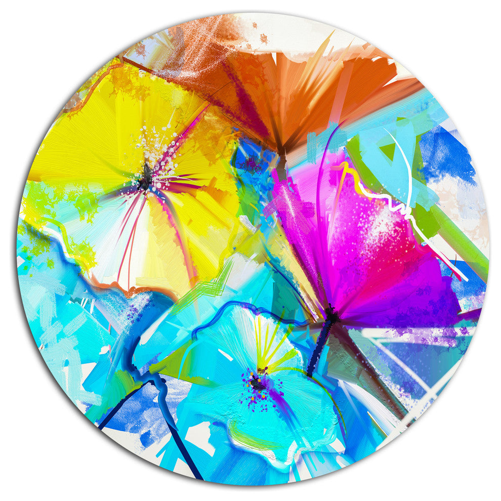 Bring Contemporary Abstraction to your home with this large Circle Metal wall art. This Abstract Spring Flowers Still Life Metal Artwork makes it the focal point of any room or office.