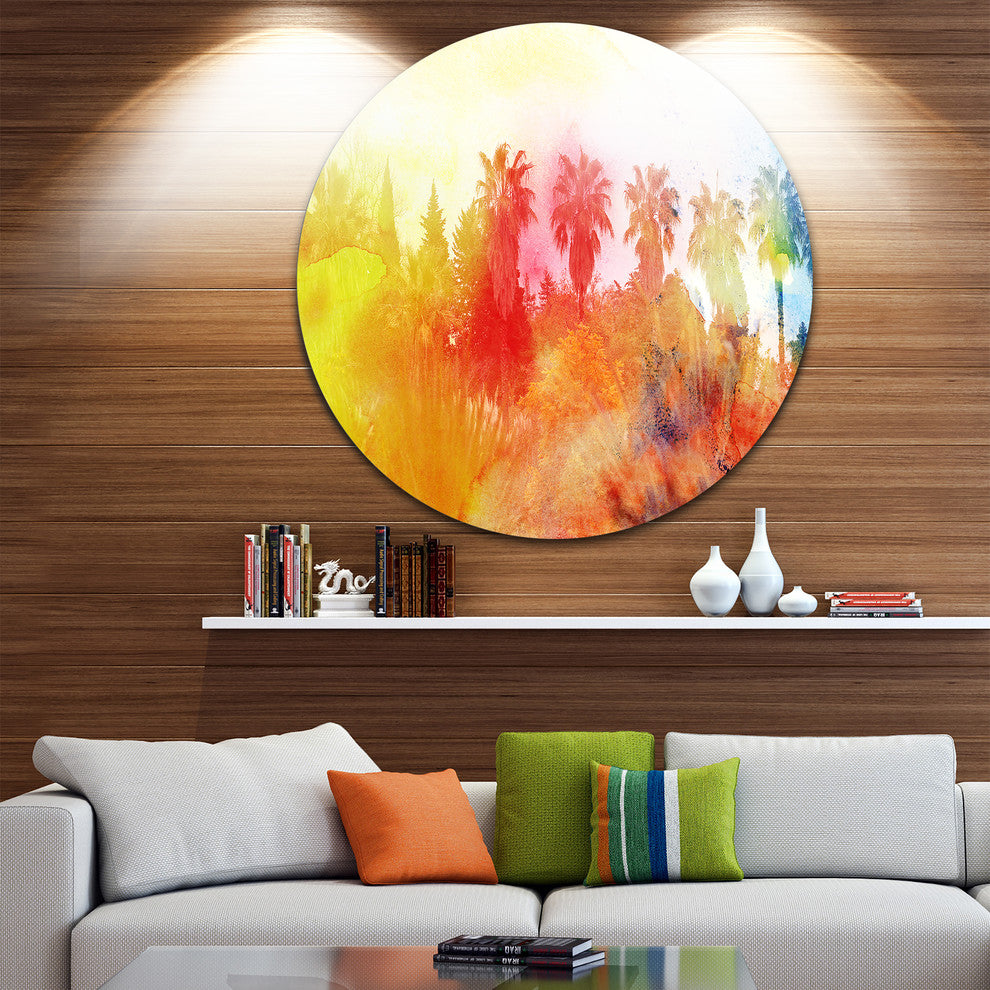 Bring Contemporary Abstraction to your home with this large Circle Metal wall art. This Abstract Tropical Landscape Metal Artwork makes it the focal point of any room or office.