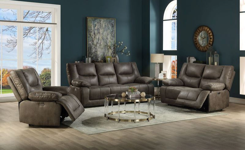 The Harumi power reclining sofa group doesn''t hold back when it comes to contemporary style. This beautiful set features leather-aire upholstery, horizontal tufting, and USB charging ports. One touch power means infinite ways to recline in style. Its deep, comfy seat and padded arms give it an incredible sink-right-in quality that''s perfect for the whole family.Features:• Finish: Gray Fabric• Material: Upholstery, Metal Reclining Mechanism• KD Back, Power Motion Reclining Function• Tight Back & Seat Cushion (2+2)• Features: Horizontal Tufted, 2 USB Charging Docks w/External Latch Push-Button• SEAT: Pocket Coil & Zig-Zag Spring, Inside Frame: Wood & Powered Metal Reclining Mechanism, Foam• BACKREST: Tight Cushion• ARMREST: Pillow Top• Metal Base with Power Motion: External Latch Push Button (Outside Armrest), Base Size: 2 Inches • Material: Fabric (Pattern)• Pillow NOT IncludedDimensions:• Product Dimensions: 64"L X 40"W X 40"H• Net Weight: 154 lbs• Package Dimensions: 62"L X 30.1"W X 25.5"H• Gross Weight: 165 lbs• Package Type: CARTON• Ship Type: LTL• Assembly Required