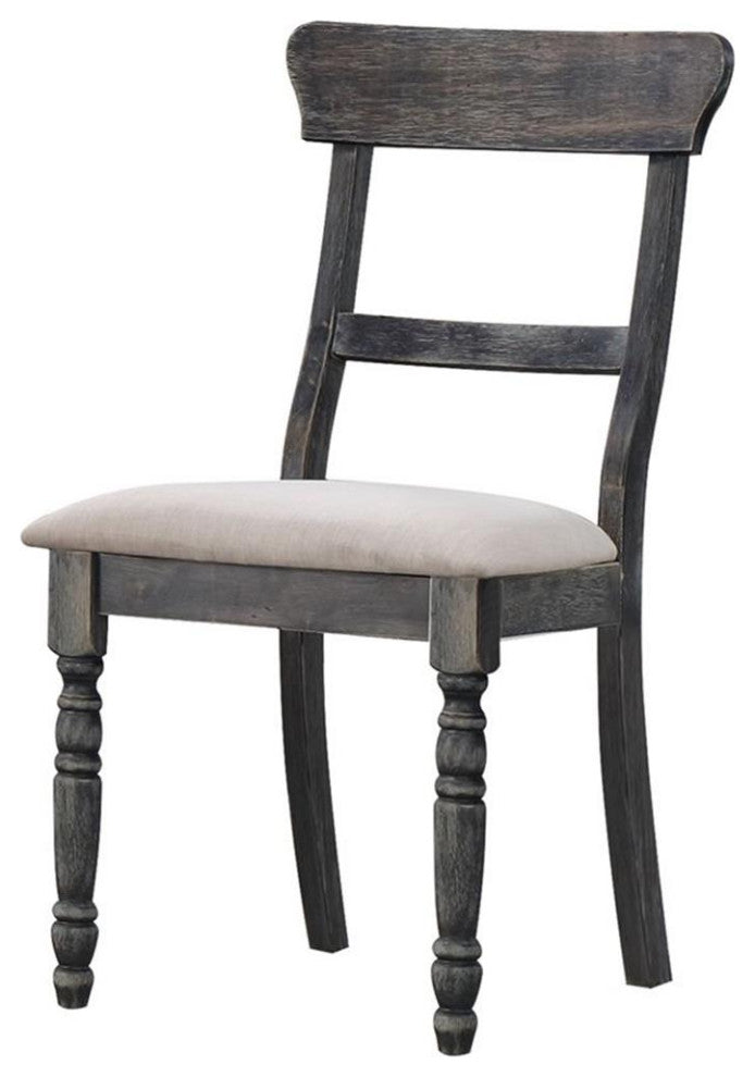 Simple yet sophisticated, the Wallace dining table delivers timeless elegance to your dining room. The dining side chair comes with slatted seat backs and upholstered seat cushions. Sitting steadily on a beautiful turned pedestal base.Features: • Finish: Light Brown and Weathered Gray • Material: Linen, Rubber Wood, MDF and Foam • Upholstered seat cushion • Backrest with single slat • Wooden turned front legsSpecifications: • Product Dimensions: 35" H x 19" W x 20" D • Product Weight: 31 lbs