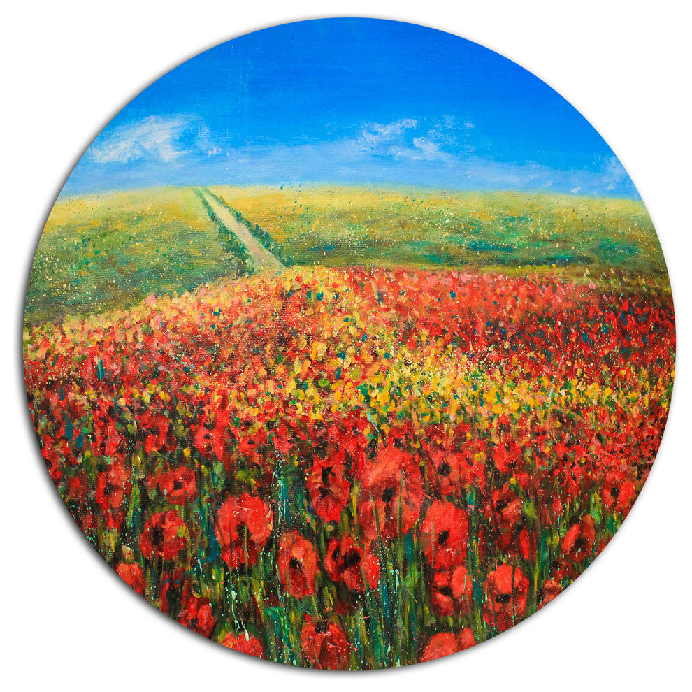 Acrylic Landscape With Red Flowers, Floral Disc Metal Artwork, 23"