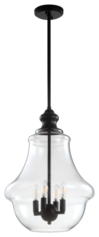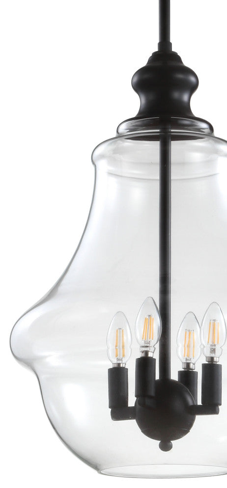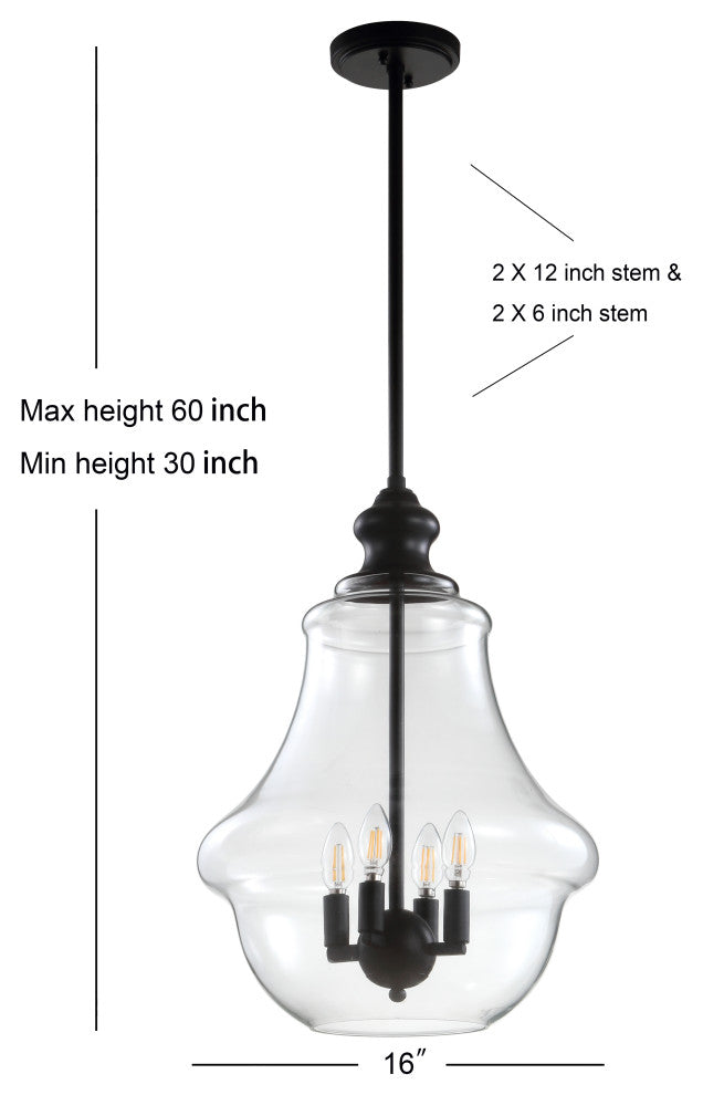 We love the combination of a striking black body and the glass shade in this pendant--a classic piece suitable for any style. With an adjustable drop, it can also look semi-custom, adjusting to your ceiling height. Perfectly suited for highly trafficked areas like kitchens and foyers.Features:• Finished in oil rubbed bronze, the metal body would suit any color palette• Fixture can be adjusted to your desired length• As this fixture must be hardwired, we recommend a professional electrician manage installation• Eco-friendly 4W LED bulb included• Takes four bulbs and compatible with any 9W LED or 40W TYPE "B" or 13W CFL• Color: Oil Rubbed Bronze• Body Material: Metal/Glass• Includes: One (1) lamp(s)• Assembly RequiredDimensions:• Lamp: 30 inches high x 16 inches wide x 16 inches deepAbout us:You see a lamp.We see a decorative work of art.A perfectly curved shade casts a dramatic shadow on a floor. A silk cord you never want to hide. LED lightbulbs: as easy on the environment as they are on the eyes. The JONATHAN Y Lighting collection considers every detail from impeccably sourced materials to designer styling. And our prices are so attractive, we''ve transformed a functional necessity into a fashion accessory.JONATHAN Y Lighting - a fashion revolution in home decor.