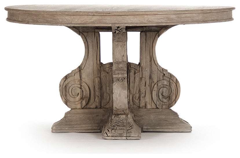 Round pedestal dining table with rustic carvings in weathered finish.Zentique combines unique designs with high-end materials to bring you the very best home decor in the business.When you order a product engineered and manufactured by Zentique, you''re guaranteed to get a product that is built to last for years and years to come. This product will come in ship-safe packaging materials and will be sure to impress!DimensionsLength: 54.5 in.