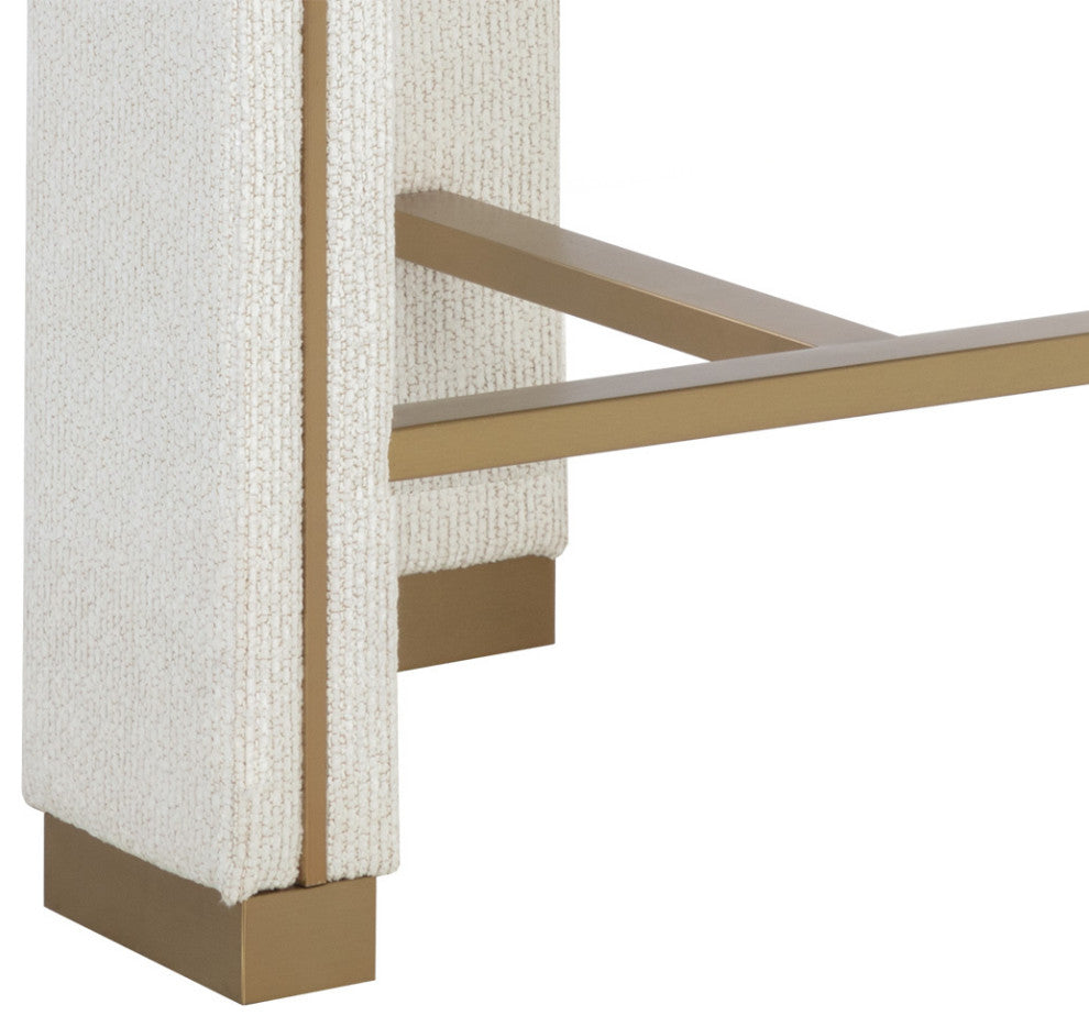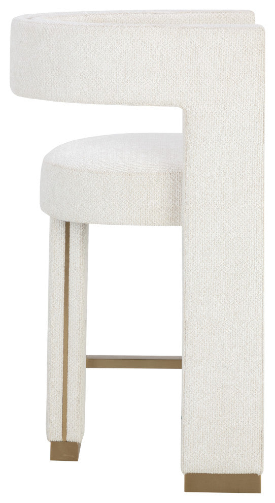 Perfectly poised with a distinct three-legged design, the Adamina Counter Stool will leave a lasting impression. Powder-coated gold metal detailing enhances the plush texture of our rhea light barley performance fabric for a stylish seating solution. Performance fabric is moisture repellent, durable and easy to clean.