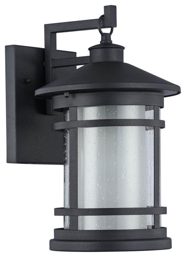 This 1-light outdoor wall sconce features a textured black finish that will complement many transitional decors. The etched glass cylinder set inside a clear glass cylinder adds interest and creates a warm welcoming glow to the outside of your home.