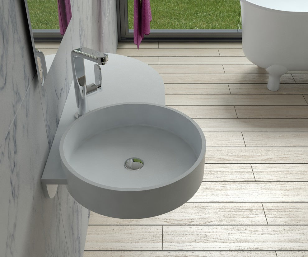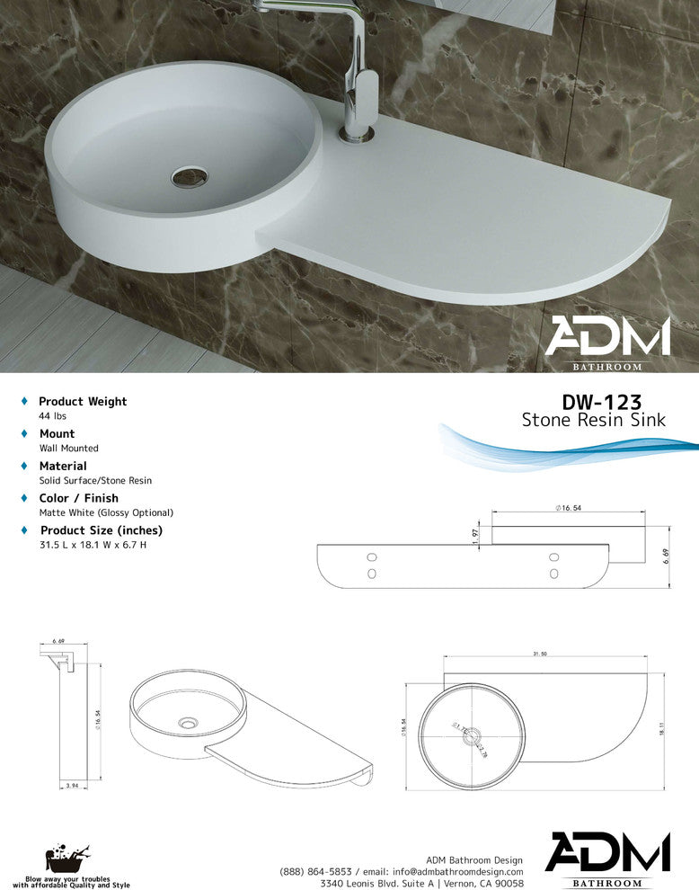 Made of durable white stone resin composite with a modern style design and its pinnacle of being smooth, the DW-123 countertop sink is a circular shaped design model within the ADM Bathroom Design sink collection. The stone resin material comes with the option of matte or glossy finish. This wall mounted sink will surely be a great addition with a neat and modern touch to your newly renovated stylish bathroom.