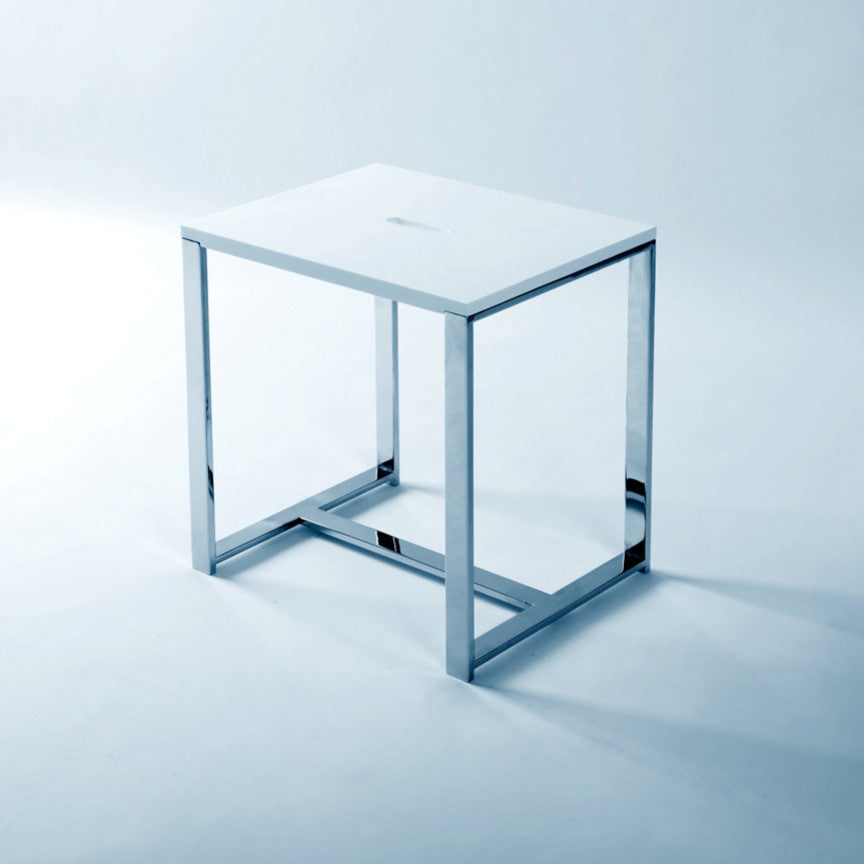 Simple and Modern, this ADM Bathroom Design Stool has a cubic design and fits into any shower space or can be used to maximize space in your bathroom. The S-105 can be conveniently used to hold shoes, magazines, towels and other necessities. This stool has a plated chrome plated steel design with a durable white stone resin composite seat and it is available in a matte or glossy finish.