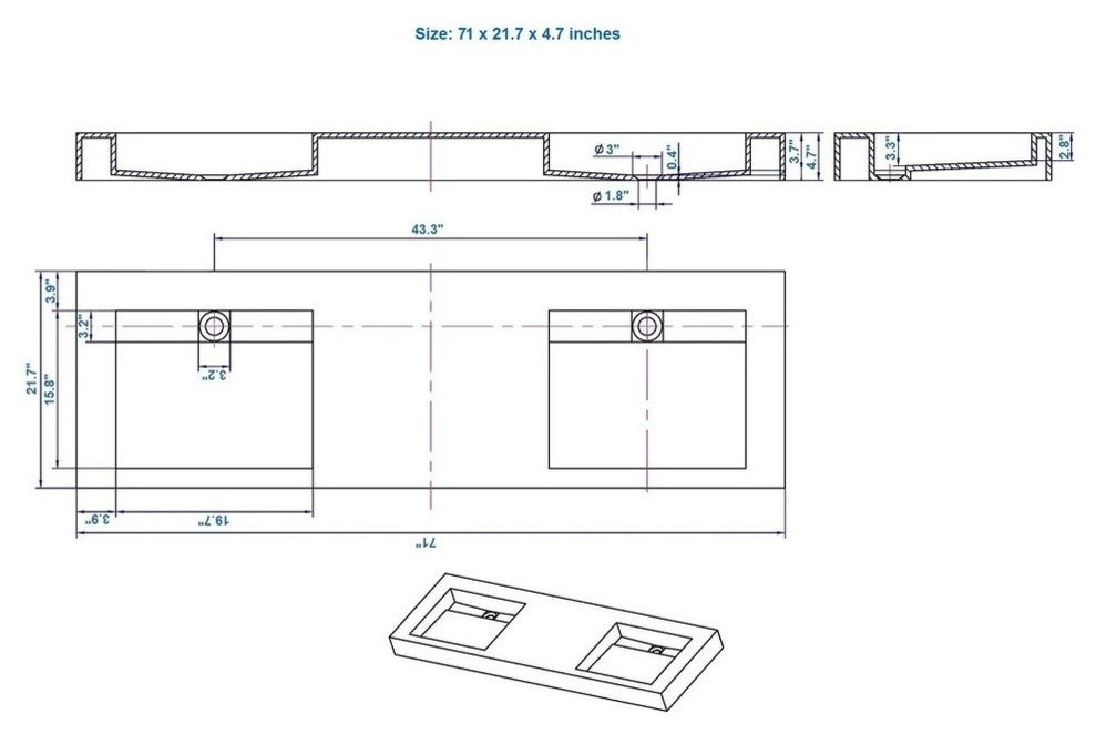 ADM Rectangular Countertop Sink, White, 71", Matte White