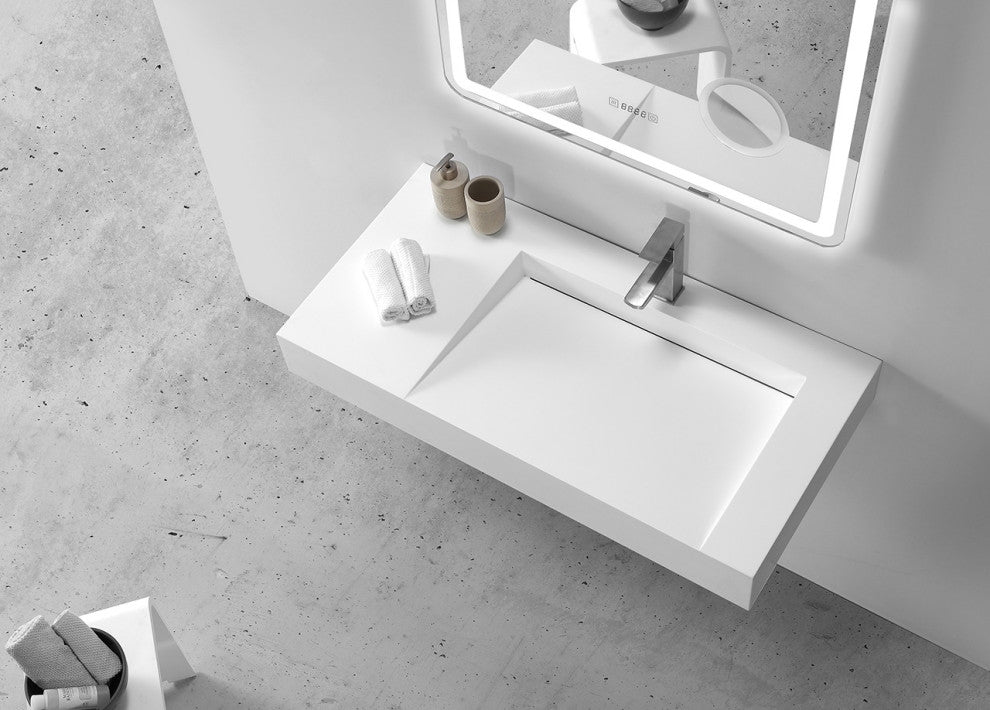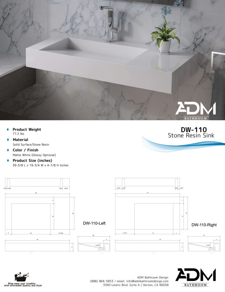 Made of durable white stone resin composite with a modern style design and its pinnacle of being smooth, the DW-110 countertop sink is a rectangular shaped design model within the ADM Bathroom Design sink collection. The stone resin material comes with the option of matte or glossy finish. This wall or counter mounted sink will surely be a great addition with a neat and modern touch to your newly renovated stylish bathroom.