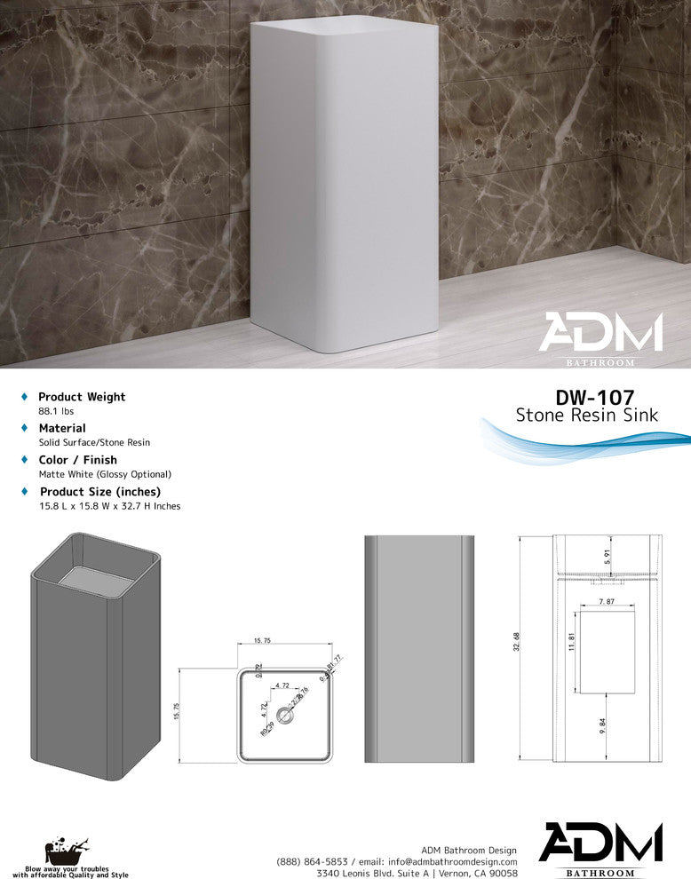 Made of durable white stone resin composite with a modern style design and its pinnacle of being smooth, the DW-107 is a square-shaped design model within the ADM Bathroom Design freestanding sink collection. The stone resin material comes with the option of matte or glossy finish. This pedestal sink will surely be a great addition with a neat and modern touch to your newly renovated stylish bathroom.