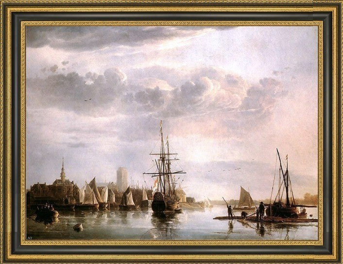 21" x 28" Aelbert Cuyp View of Dordrecht framed premium canvas print reproduced to meet museum quality standards. Our Museum quality canvas prints are produced using high-precision print technology for a more accurate reproduction printed on high quality canvas with fade-resistant, archival inks. Our progressive business model allows us to offer works of art to you at the best wholesale pricing, significantly less than art gallery prices, affordable to all. This artwork is hand stretched onto wooden stretcher bars, then mounted into our 3 3/4" wide gold finish frame with black panel by one of our expert framers. Our framed canvas print comes with hardware, ready to hang on your wall. We present a comprehensive collection of exceptional canvas art reproductions by Aelbert Cuyp.