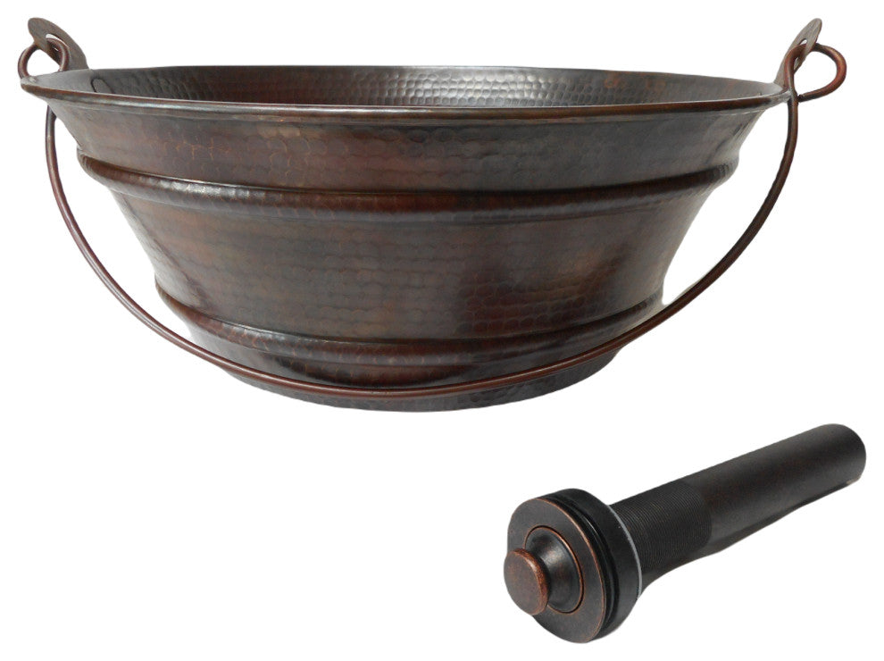 15"� rustic farmhouse Bucket design, created of 18-gauge copper which is hand-hammered to provide a rustic antiqued look. This unique sink will be the center piece of your bathroom. This copper sink is installed as a vessel Model: H-B-15-LT Shape: Round Outside Dimensions: 15" X 6"D Inside Dimensions: 15" x 6"D Bottom Dimensions: 10" Edge (Lip): Wire Rimmed Drain Opening: 1-1/2" { Non-Overflow } Drain Included -Lift & Turn Drain (holds water) Design: Hand-Hammered Surface Gauge: 18 Material: Copper Finish: Aged Copper Overflow: No Installation Type: Vessel Warranty: Limited LifetimePlease Note: Each sink is handmade by Skilled Artisans. Our sinks are unique and one of a kind. You will use the sink as your template as dimensions can vary slightly due to the handmade nature.Variations in the patina are normal and not considered to be a defect. We recommend a professional for installation. Use only mild soap and water with a soft cloth for cleaning. Included: (1) Copper Sink (1) Drain Installation Instructions Copper Sink Care Warranty Information