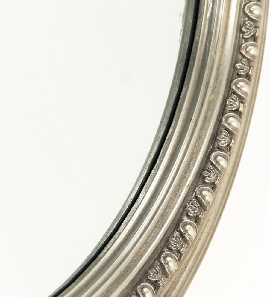 The Aimee Mirror features a convex beveled mirror with a round silver embellished frame.