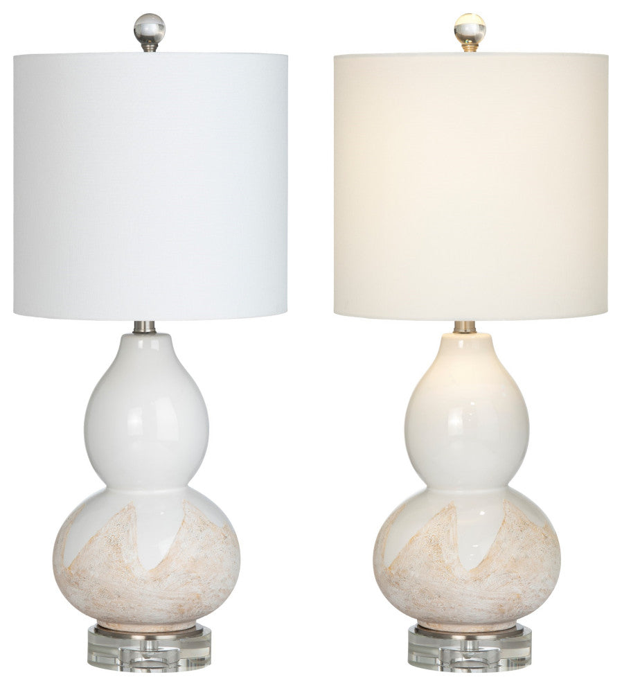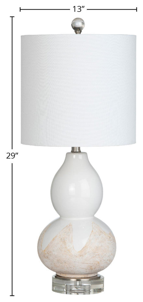 Welcome the Ainsley 31" Table Lamp into your space, a sophisticated lighting fixture+E11. This lamp boasts a classic double gourd form, fabricated from glossy white ceramic for a clean and sleek aesthetic. The subtle hint of exposed underglaze at the base lends a softened organic feel to its design. Complemented by a chunky crystal vase base, and finished with a white linen drum shade, the lamp''s overall design is notably elegant. Not only beautifully crafted but also versatile, the Ainsley table lamp''s neutral color scheme seamlessly adapts to various decor styles.Features• Overall product dimensions are 13" W x 13" D x 31" H• Offers 3 versatile lighting options, allowing adjustment between 3 different levels of brightness• Has a cylindrical, drum-shaped linen shade• Accommodates a 150W max bulb, delivering ample illumination• Boasts a timeless double gourd shape crafted in glossy white ceramic, adding a touch of classic eleganceDimensions:Table Lamp• Assembled Product: 13 inches wide x 13 inches deep x 31 inches high