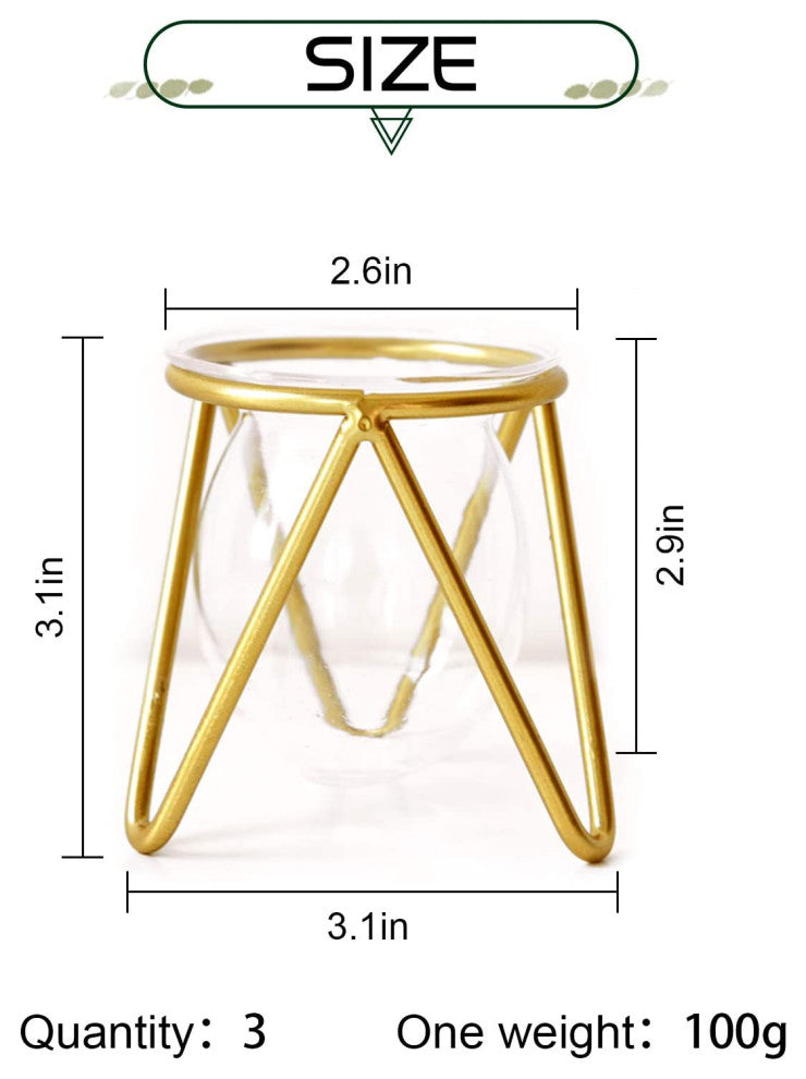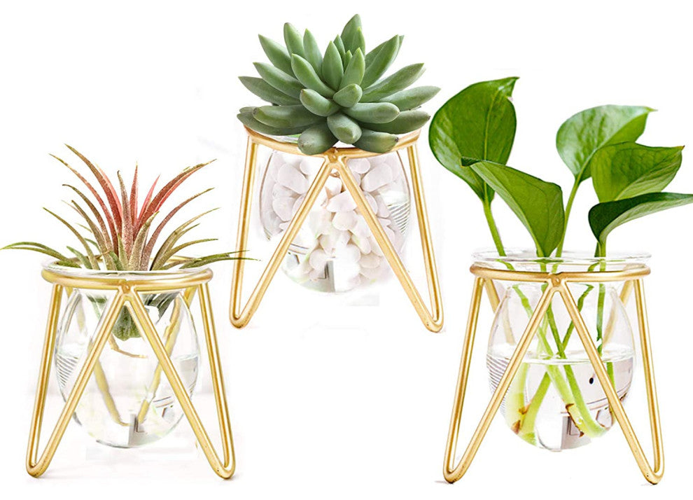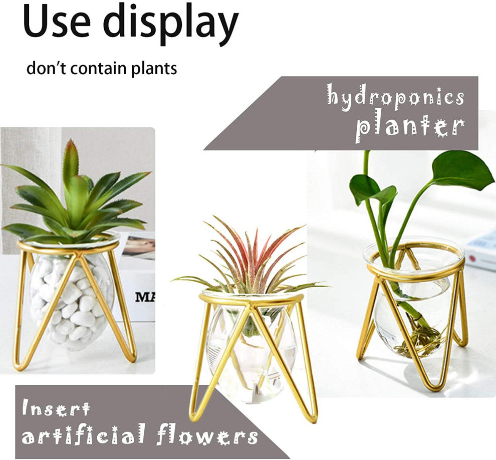 Geometric glass hydroponic vase provides growth space for air plants to absorb air & water. Air plant holder is suitable for place air plants, hydroponic, tillandsias, flowers. Perfect mini plants set versatile for home and office. Gold Vases Home Décor. Plant some mini succulents plants live to look more vibrant. Plant propagation can decorations for women desk. And the vases for living room decorations is good. With its gold air plants live holders base and terrarium glass containers, it will be probably the most adorable way to showcase your greenery. Mini Gold Metal Geometric put some hydroponic, air plants, artificial plants, and put a few pebbles in a vase to make it more beautiful. The plant propagation station is suitable for succulent ornament, room, study, dining table, living room, office, desktop, indoor, etc. Add a touch of green to life- Simple Design-The gold metal air plant terrarium combination of air plant frame and high transparent glass vase is simple and elegant. Special decorations like this hydroponic vase can enhance the beauty of home decoration. Geometric planter is good for decorations for women desk.Material & Size-We use a sturdy gold plant stands and high transparent glass. The mini air plant stand size is 3.1" W• 3.1"H. The small gold flower vase size is 2.6" W• 2.9"H.(Not include plants)Good gifts- Gold vase set of 3. You can grow succulent plants in pots for your friends, families and plant lover . Makes a great gift for the holidays, Valentine''s Day, Mother''s Day, housewarming, wedding, birthdays, anniversary. The propagation jars creates a sense of happiness and makes you warmGold Planter Set Features "“Air plants live holders, stable and durable. Hand-welded, bottle mouth smooth, air plant terrarium and geometric glass plant holder design separate. It is also easy to clean. Air plant holder unique and novel