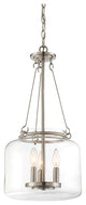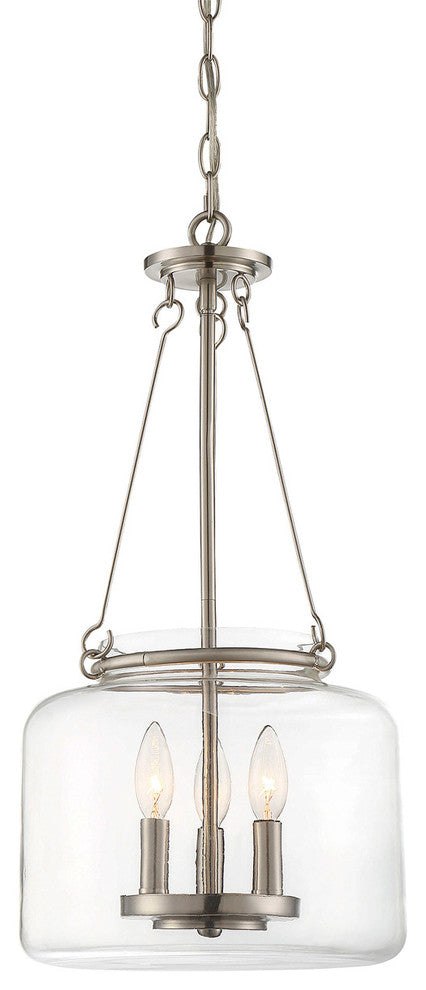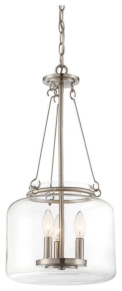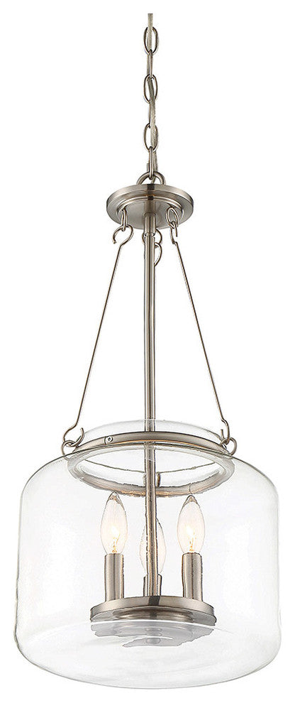 The Akron 3-Light Pendant from Savoy House proves that a simple style can be stunning. Its square glass shade protects the light sources within and is accentuated by thoughtfully-detailed hardware.Extends: 5.5"Voltage: 120Bulbs included: NoNumber of bulbs: 3Type of bulbs: CMax. wattage per bulb: 60Safety rating: UL, CULGlass: ClearFinish: Satin nickelMaterials: Metal and glassDimensions: W 12" x D 12" x H 24"