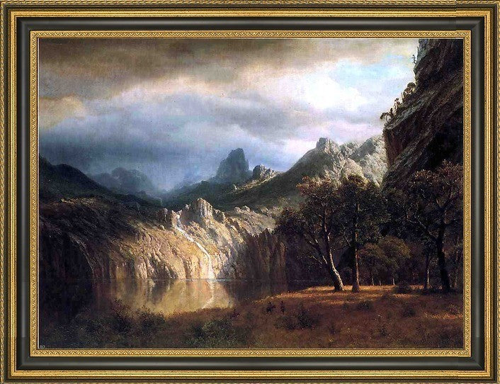 18" x 24" Albert Bierstadt in Western Mountains framed premium canvas print reproduced to meet museum quality standards. Our Museum quality canvas prints are produced using high-precision print technology for a more accurate reproduction printed on high quality canvas with fade-resistant, archival inks. Our progressive business model allows us to offer works of art to you at the best wholesale pricing, significantly less than art gallery prices, affordable to all. This artwork is hand stretched onto wooden stretcher bars, then mounted into our 3 3/4" wide gold finish frame with black panel by one of our expert framers. Our framed canvas print comes with hardware, ready to hang on your wall. We present a comprehensive collection of exceptional canvas art reproductions by Albert Bierstadt.