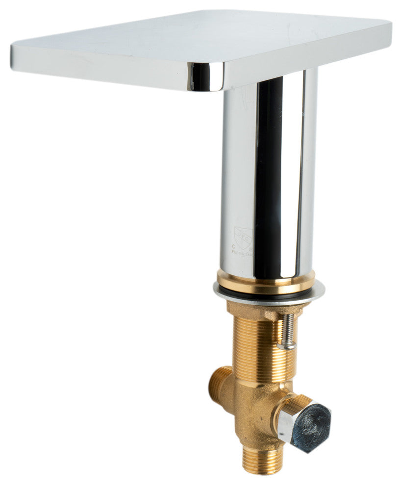 Modern & unique flat rectangular shelf style spout with single lever handle.