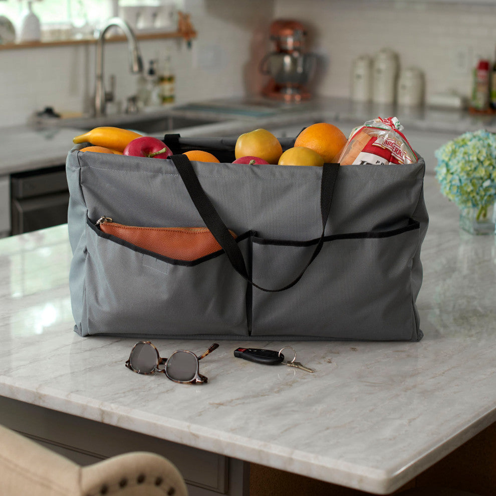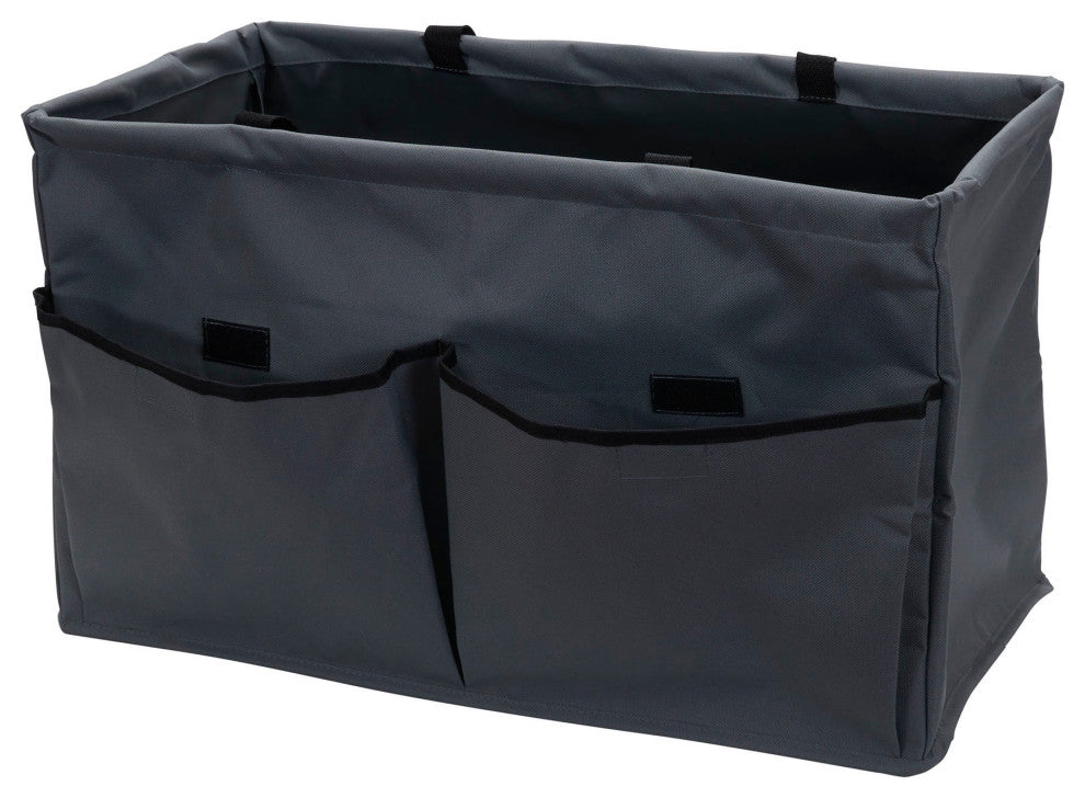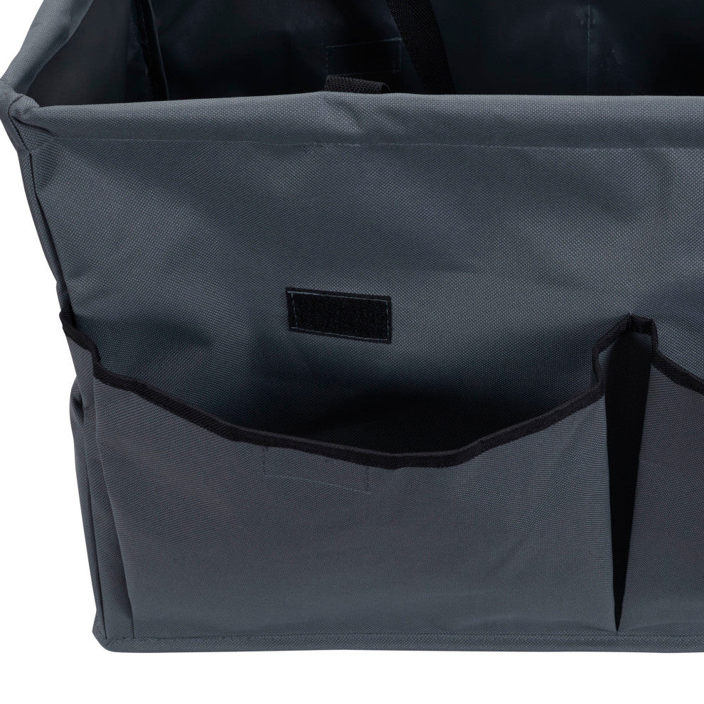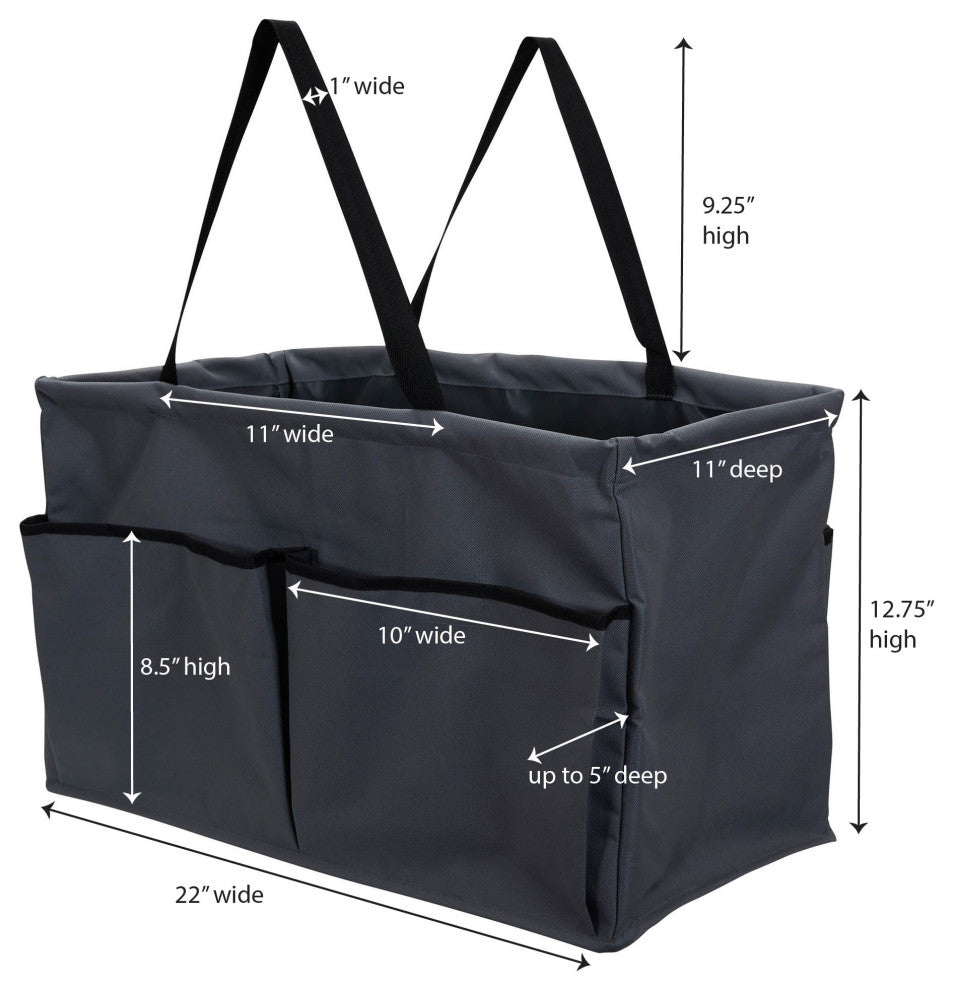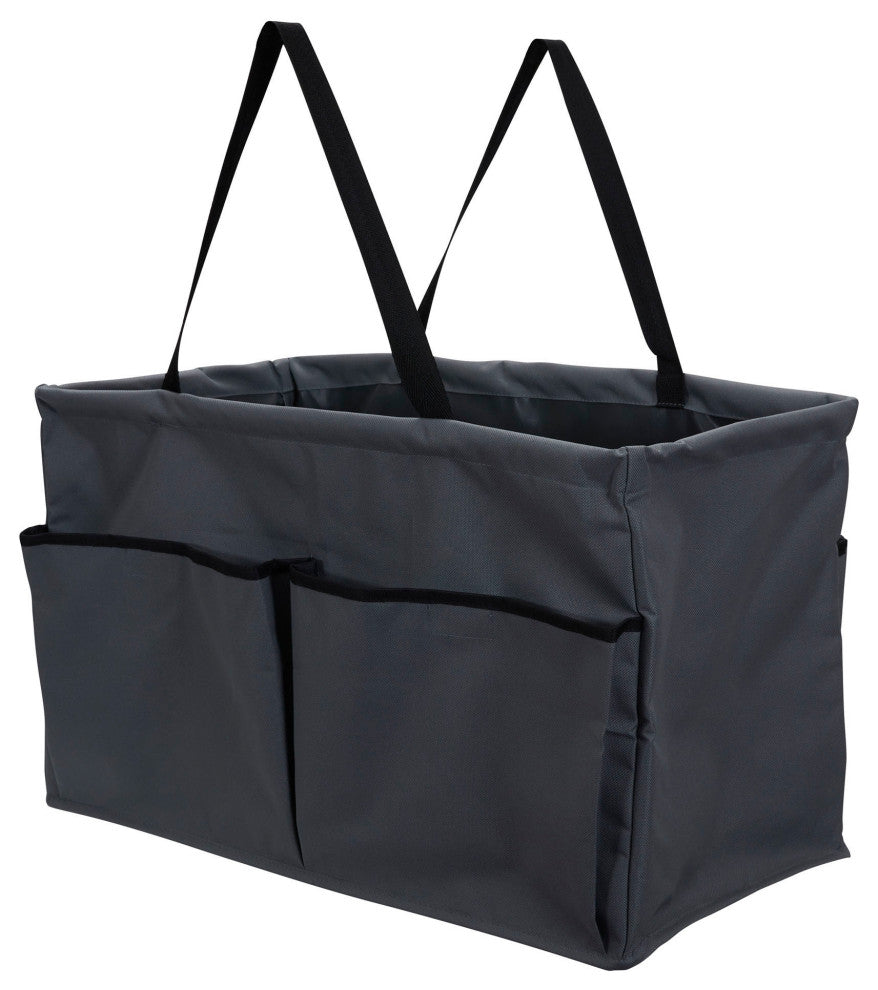 This versatile utility tote is spacious, durable, practical and has a variety of applications. It''s perfect for beach days, camping trips, picnics, tailgating, kids'' sports games, grocery shopping, hauling laundry or just as an organizer tote in your trunk or home. The bag is made of canvas with a water-resistant vinyl lining. The lining is grafted into the fabric, so it adds durable protection without extra weight or bulk. The water-resistant lining means easy clean up, on the inside or outside of the bag. Prevent moisture from seeping into the bag from wet sand or grass, and keep moisture from condensation or spills inside the bag from leaking out. The lining also helps prevent staining and makes the bag easier to clean. The bag has two long handles attached for easy carrying, and four large exterior pockets with hook-and-loop closures to keep them secure. These pockets are perfect for keeping essential items within easy reach, such as sunscreen or sports drinks, without having to dive into the bag''s large main compartment. The bag''s long rectangular shape is especially well suited for any trunk, making this a great bag to keep with you in your car. Use it to carry essentials, like emergency kit items or tools, or just as an organizer for other car essentials. Fill it up with car or dorm essentials before sending a new grad on their way, or fill it with drinks and snacks for a road trip. The durable lining means you can use the bag to house trash from finished drinks and snacks, too, knowing you''ll have an easy clean up later. When the bag is not in use, it folds flat for easy storage. To clean it, give it a rinse and use the hanging loop attached to the bag to hang it out to dry.