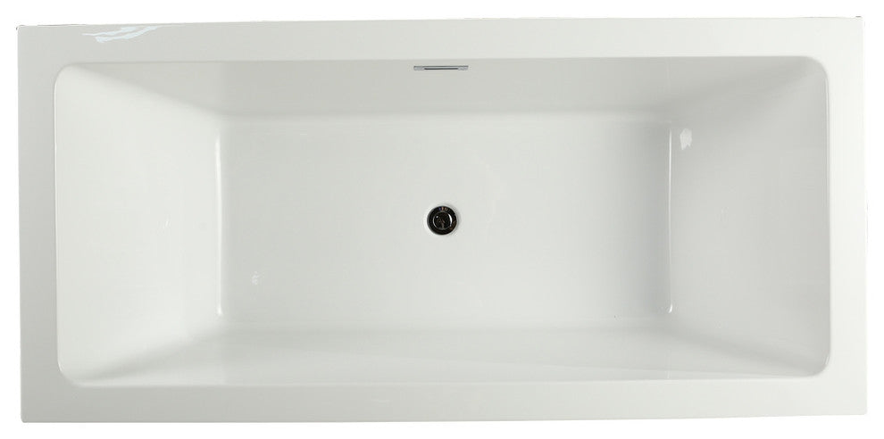 This cutting-edge, freestanding bathtub by Vinnova immediately catches the eye, featuring straight angles, gently sloping sides, and a recessed base. Chrome and brass accents add a pop of metallic shine against the pure white finish. Ideal for a guest bath or a luxury master bathroom.