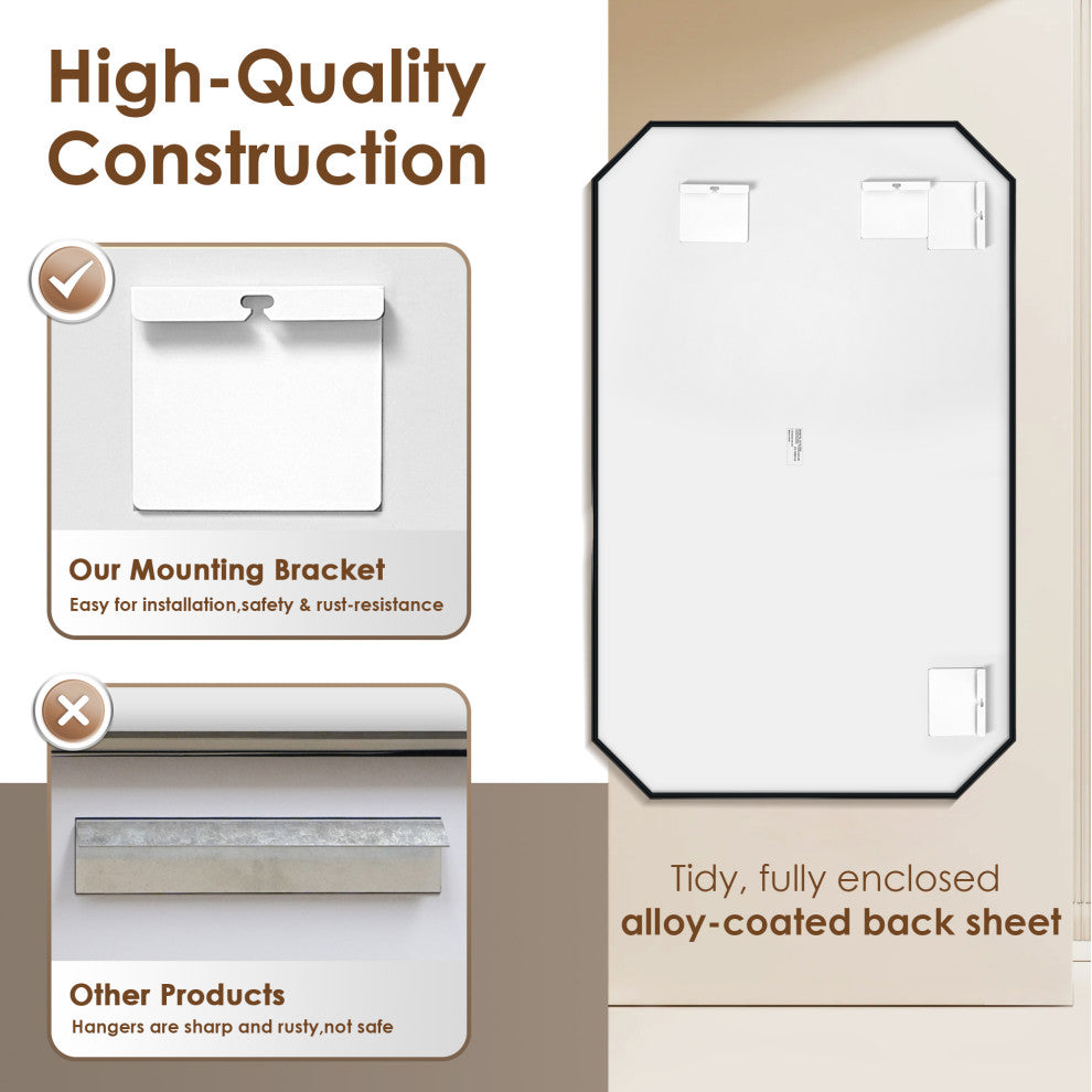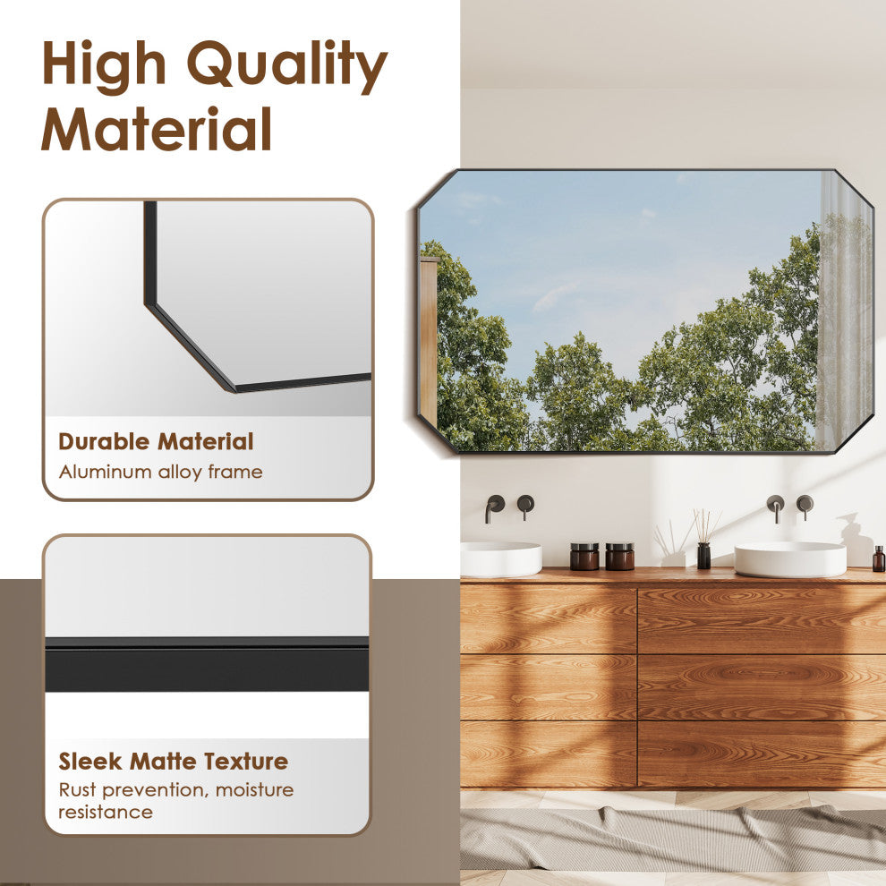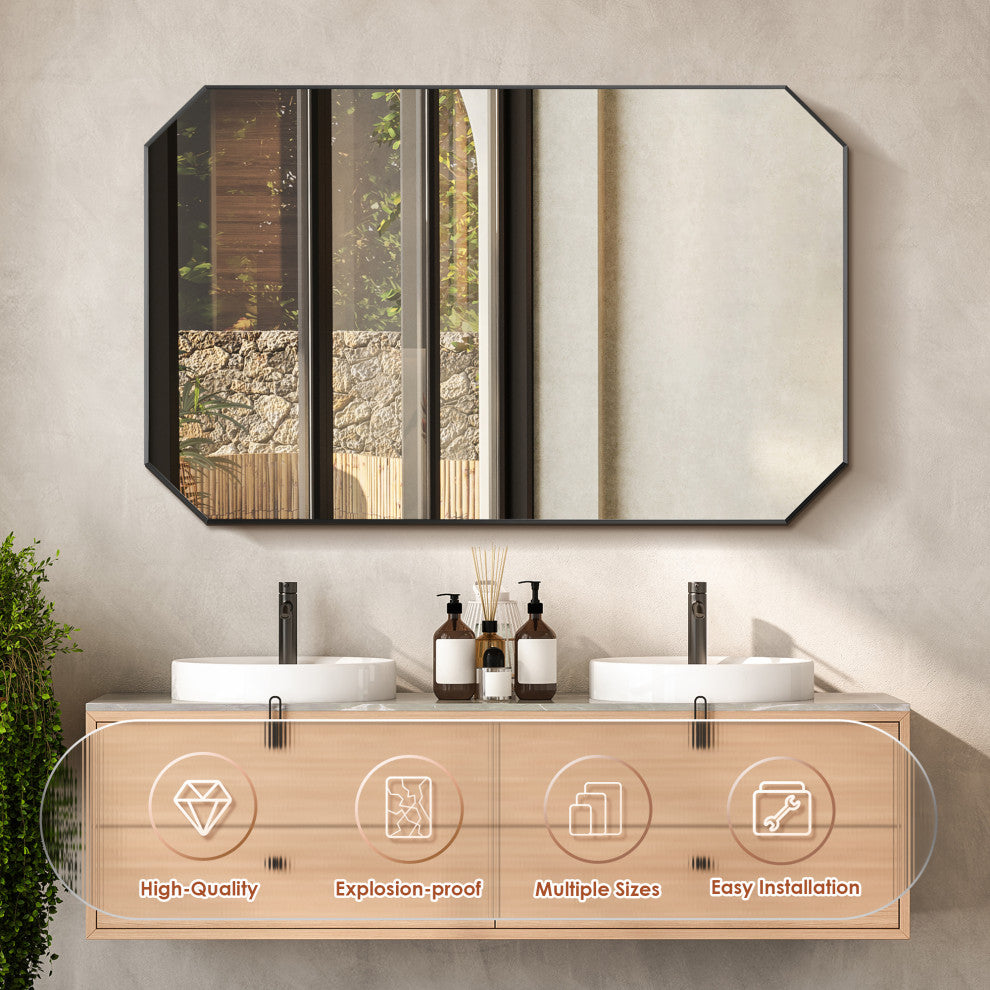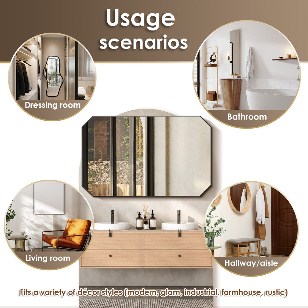 Introducing the Allure Collection-designed with elegance and innovation in mind. This unique octagonal bathroom mirror breaks away from tradition, adding a distinctive touch to your space. Its versatile design allows for horizontal or vertical hanging to suit your style. Crafted from 5mm copper-free glass and durable aluminum, it offers excellent corrosion resistance and durability for everyday use. Available in sleek Matte black or refined brushed gold, it seamlessly complements your desired aesthetic. Elevate your home"™s brightness and ambiance with the Allure Collection.FeaturesThe mirror features a sleek, minimalist aluminum frame that effortlessly complements a wide range of styles.Crafted with a durable aluminum frame, it is both lightweight and sturdy, ensuring stability without shaking.The octagonal shape breaks away from traditional designs, adding a distinctive touch to your décorIn the event of accidental breakage, the explosion-proof film prevents glass splashes for enhanced safetyAvailable in Matte Black and Brushed Gold finish to match and enhance your décor.The 5mm thick high-definition glass provides clear, precise reflections, showcasing your charm and confidence.The mirror is easy to clean for added daily convenience; simply use a soft cloth and a non-abrasive, colorless cleaner.Supports both horizontal and vertical hanging to accommodate a variety of design preferences.Polished mounting brackets feature curved edges for safer, easier installation.Available in multiple sizes to suit your design needsDesigned to suit your preferences, this mirror complements a variety of décor styles, including modern, glam, industrial, farmhouse, and rustic.The installation process is quick and easy, requiring minimal effort and no prior experience, saving you time.