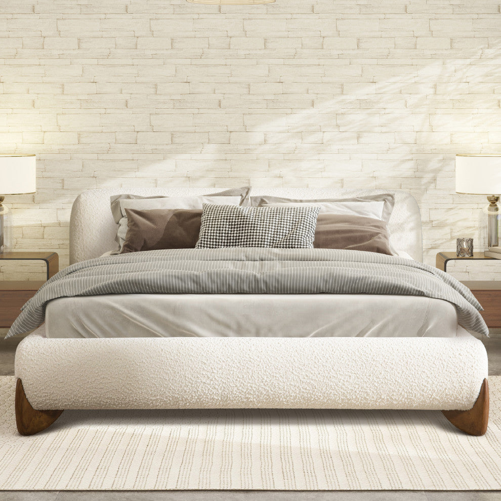 Alpine Sherpa Modern Platform Bed, Ivory White Boucle, Queen