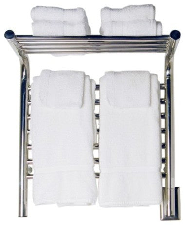 Amba Jeeves shelf towel warmer features 7 straight horizontal bars plus an additional 4 bars on the shelfElectric towel warmer features 100% high quality stainless steel. Liquid-Filled Warming System. NO INTEGRATED SWITCH.This unit warms and dries towels while helping to keep bathrooms mold and mildew free.Available in 4 finishes: polished and brushed stainless steel, oil rubbed bronze, and white.Unit dimensions are 20.5"W x 22"H.Boasting an Automatic Heating Technology with a built-in thermostat, all Jeeves models self-regulate to maintain the ideal internal temperature range and reduce power consumption.Two-fold benefit: optimum operating temperatures and the lowest electrical consumption without any user input.Two safety cutout features are equipped on all models for added safety and peace of mind.Jeeves towel warmers take between 30 to 45 minutes to reach optimum temperature.UL-certified for use in the USA and Canada, the Jeeves units are approved for installation around water sources and above bathtubs.Accessories such as Bathrobe Hangers, Shelf Bars and Programmable Timers can be added to the unit for extra functionality.Wiring is also available on the left side for an extra charge, upon request.Does NOT include an integrated switch.Width 20 1/2"Height 22"Depth 15 1/4"Watts 135BTUs 460Amps 1.25Ave. Temp Range 145154 degreesFSafety Cutout 158 degreesFSecurity Thermofuse 242 degreesFGross Weight 25 lbsNet Weight 24 lbs Return/Warranty Policy: Returns accepted within thirty (30) days of your order ship date. please contact us to receive an RGA (Return Goods Authorization). We will only accept a return if it is returned in the original manufacturer''s packaging and has not been manipulated in any way. Returns of incorrectly ordered products are subject to a 25% restocking fee. If you have ordered incorrectly, wish to order the correct product and return the incorrect product, your restocking fee will be 15%. Once the product has been received at our warehouse, it will be inspected and you will be credited for the returned product less the applicable restocking fee and original shipping and processing charges. If you wish to return a product but do not place a reorder, the restocking fee will be 25%. Once the product has been received at our warehouse, it will be inspected and you will be credited for the returned product less the applicable restocking fee and original shipping and processing charges. If within thirty (30) days of your order ship date, any product proves to be defective; please contact us. Do not ship the product without contacting us first to receive the return instructions and Return Goods Authorization Number. Any time after the thirty-one (31) days of your order ship date, if a product proves to be defective; please contact us to receive instructions. Return will be at the customer''s expense. Please be sure to adequately package your product. Once the product is received it will be properly inspected and tested. Should we determine that the product is in fact defective, under warranty terms, it will be repaired and tested. If you choose to return the defective item, rather than replace it, we will charge a 15% restocking fee and your original shipping and processing charges will not be refunded. The return of the product is at your expense. This may only be done within the product warranty period. Items returned after 90 days are subject to a 40% restocking fee or may not be returnable at all (This applies to current versions only). We will let you know our decision once we respond to your request.