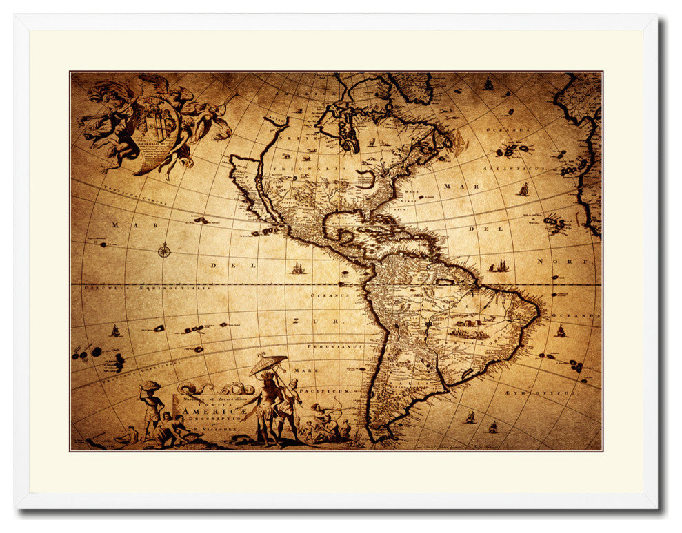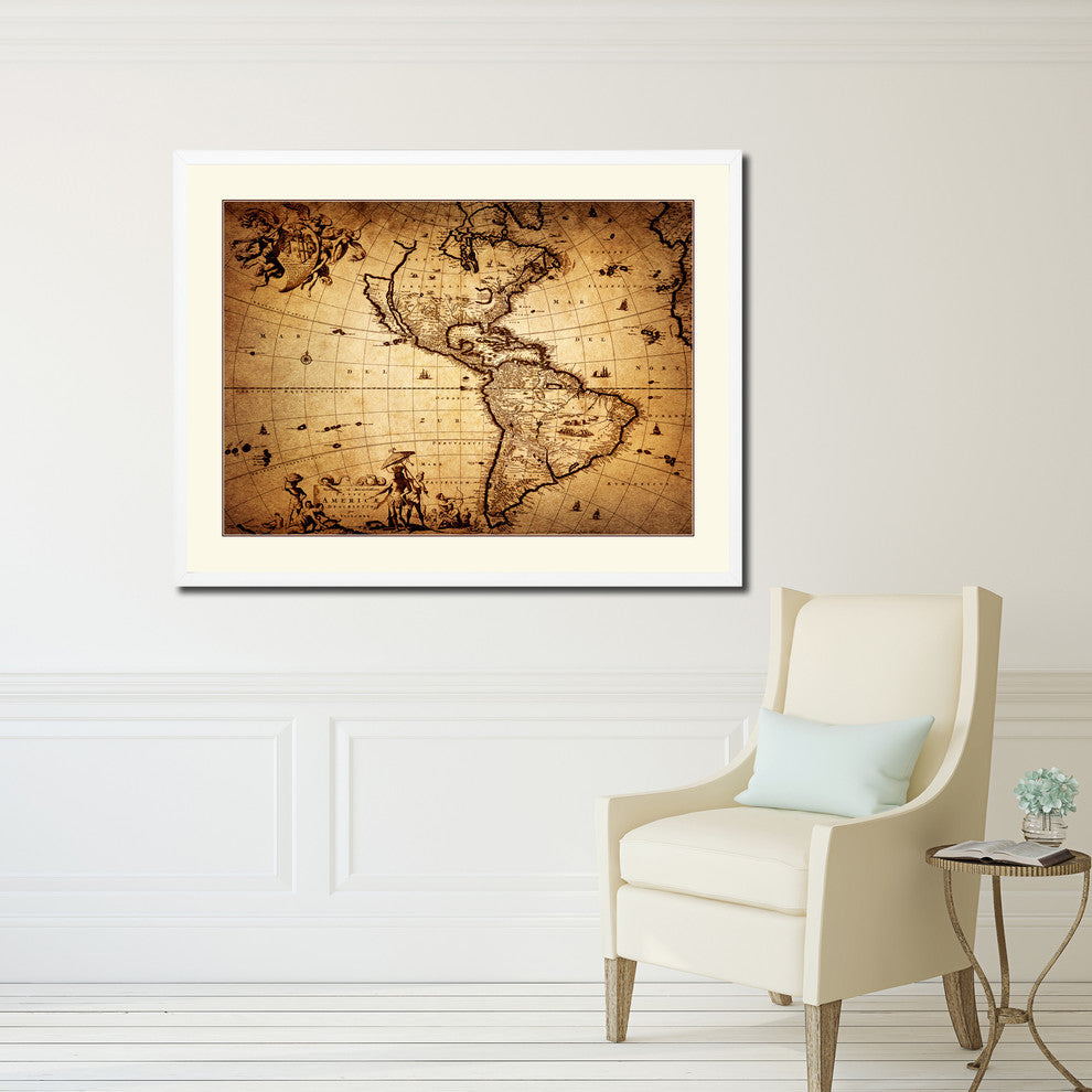 America Vintage Old Map Print On Canvas With Picture Frame 28" X 37"