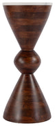 Enhance your living space with the timeless elegance of the Butler Specialty Company Amra side table. Its pristine white marble top exudes luxury, perfectly complemented by the rich, dark brown wood of its drum-shaped base. This exquisite piece seamlessly blends classic and modern elements, creating a stunning focal point that elevates any room''s decor. Let the Amra side table bring a touch of sophistication and natural beauty to your home. The color is dark brown/white Exceptionally built using Mango Wood, Marble and Iron Construction Details: Base is made from sustainable mango wood with a marble top Shape is round with a cone shape base Product Dimensions: 11.5"W x 11.5"D x 26.75"H, Item Weight: 20 lb Item requires quick and easy assembly of table top to base. Complete your perfect look by mixing and matching your decor with the extensive range of products from Butler Specialty Company! Discover endless possibilities to express your style and create a space that truly feels like home. Marble features a smooth top with subtle gray veining Marble is a natural stone product and is known for its variation in color, carbon deposits and veining patterns. Variations in shade and markings are normal and can be expected with the natural materials used in the construction of this product. Due to the porous nature of marble, it is vulnerable to staining agents and high heat. Avoid placing hot or wet items on the surface. Coasters highly recommended. Weight Capacity: 25 lbs Ideal for use as a side table, end table or accent table in a living room, bedroom, office To clean, wipe with a dry cloth; dust regularly. No harsh chemical cleaners that can damage the wood or marble. Photo may slightly differ from actual item in terms of color/finish due to the lighting during photo shoot or the monitor''s display