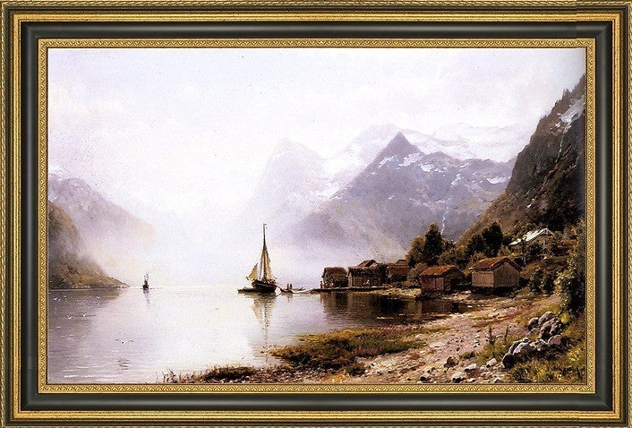 16" x 24" Anders Monsen Askevold Norwegian Fjord with Snow Capped Mountains framed premium canvas print reproduced to meet museum quality standards. Our Museum quality canvas prints are produced using high-precision print technology for a more accurate reproduction printed on high quality canvas with fade-resistant, archival inks. Our progressive business model allows us to offer works of art to you at the best wholesale pricing, significantly less than art gallery prices, affordable to all. This artwork is hand stretched onto wooden stretcher bars, then mounted into our 3 3/4" wide gold finish frame with black panel by one of our expert framers. Our framed canvas print comes with hardware, ready to hang on your wall. We present a comprehensive collection of exceptional canvas art reproductions by Anders Monsen Askevold.