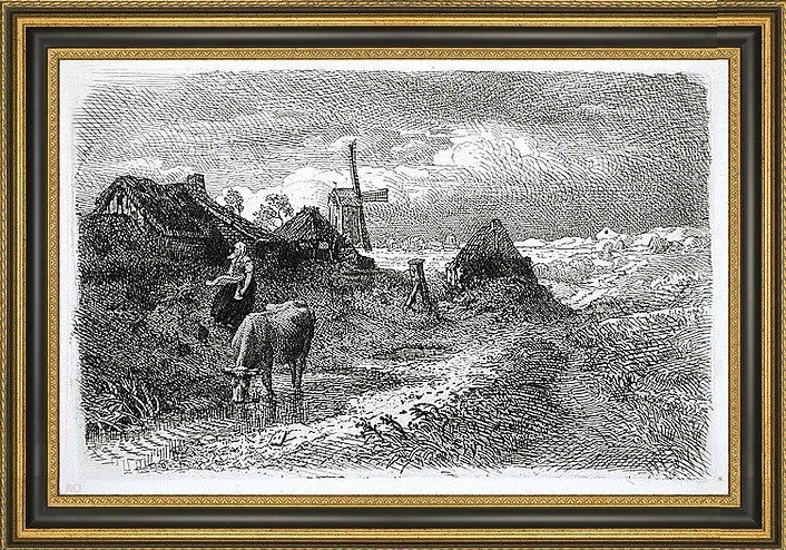 18" x 27" Andreas Achenbach Dutch Landscape with Woman and Cow framed premium canvas print reproduced to meet museum quality standards. Our Museum quality canvas prints are produced using high-precision print technology for a more accurate reproduction printed on high quality canvas with fade-resistant, archival inks. Our progressive business model allows us to offer works of art to you at the best wholesale pricing, significantly less than art gallery prices, affordable to all. This artwork is hand stretched onto wooden stretcher bars, then mounted into our 3 3/4" wide gold finish frame with black panel by one of our expert framers. Our framed canvas print comes with hardware, ready to hang on your wall. We present a comprehensive collection of exceptional canvas art reproductions by Andreas Achenbach.
