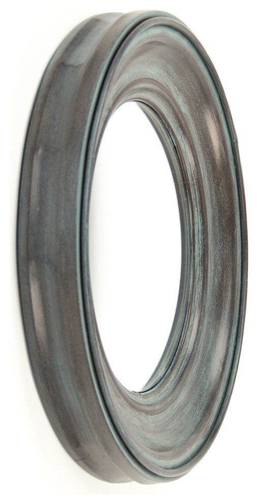 The Angeletta Mirror is a circular convex mirror with a weathered green framed.