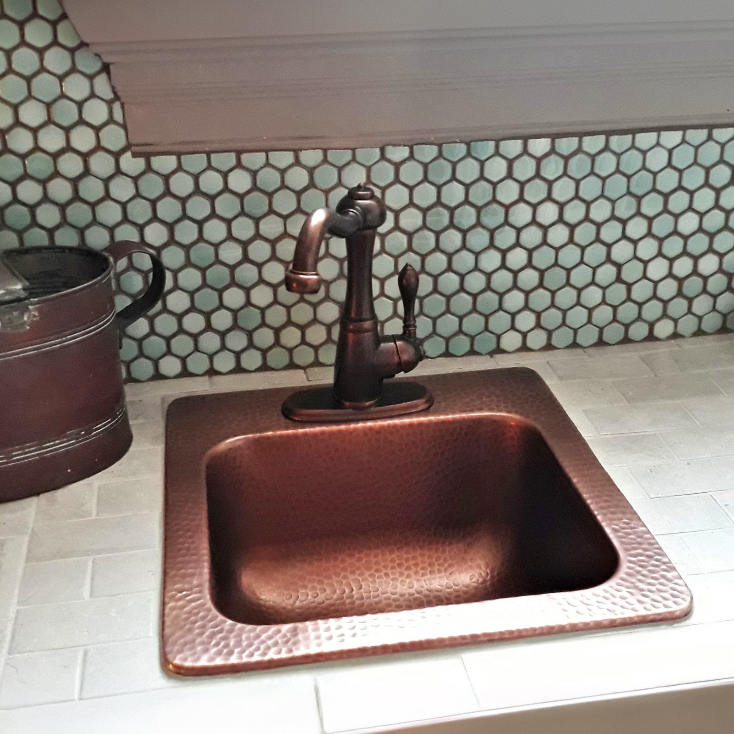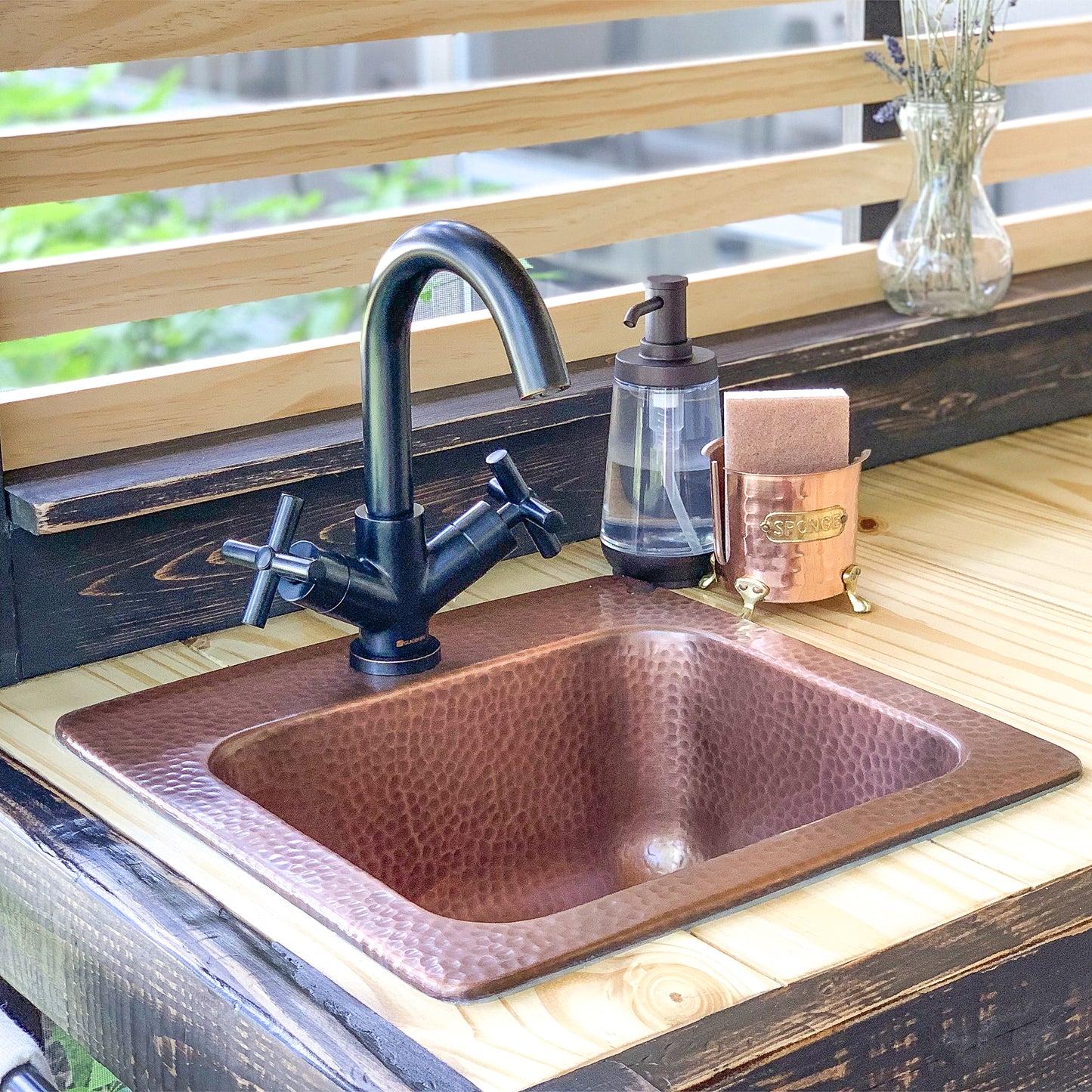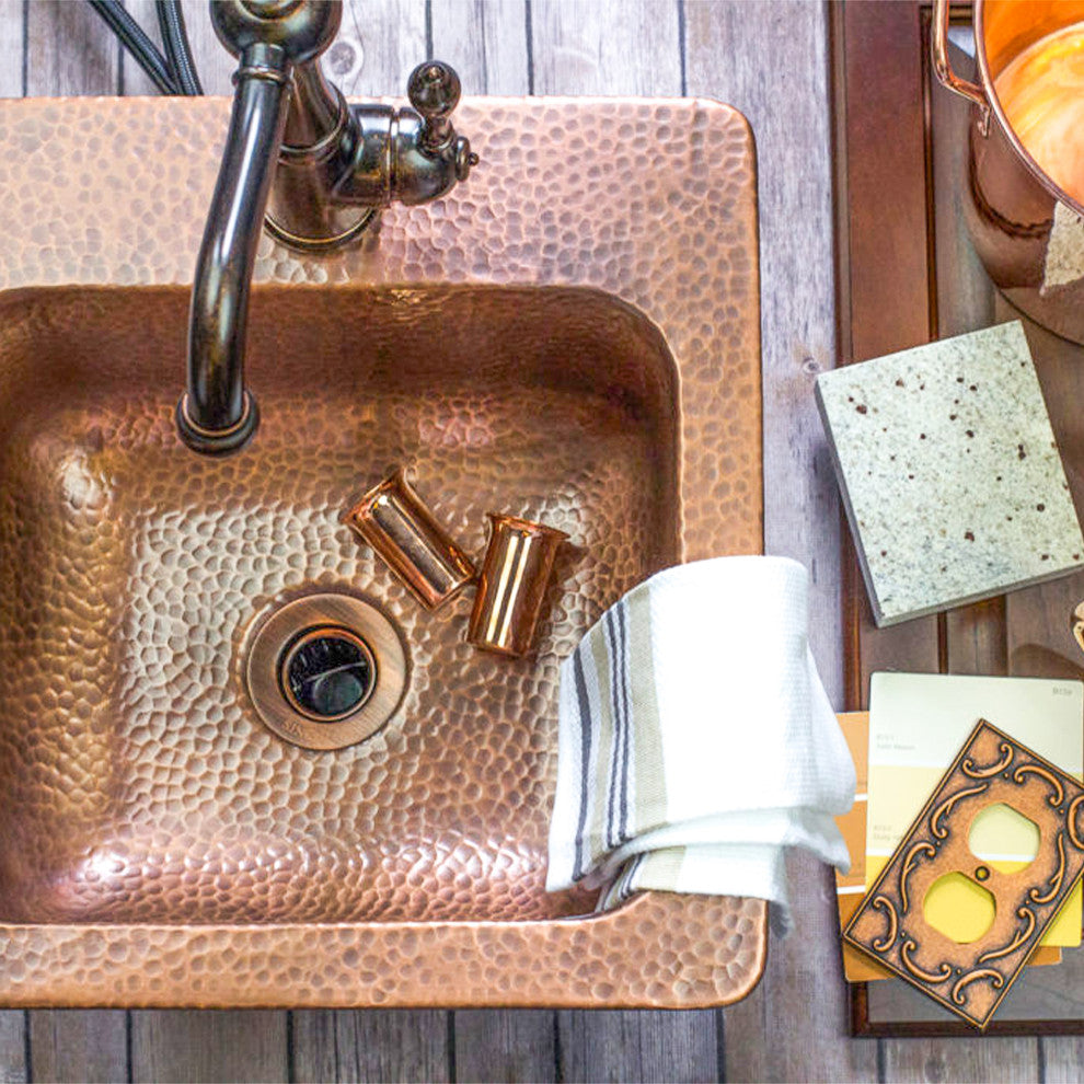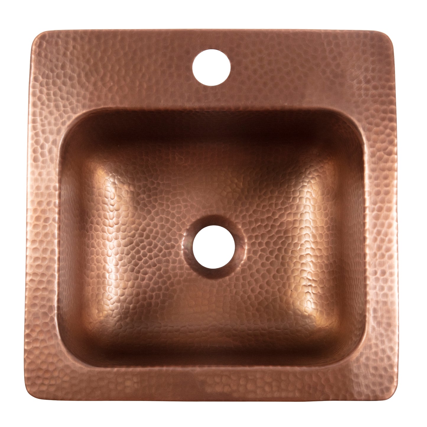 Just because you need to save space doesn''t mean you have to sacrifice style. The Angelico drop-in copper kitchen sink offers a space-saving design with a beautiful, timeless appeal. The single bowl ensures maximum workspace for washing dishes or prepping meals - even in smaller spaces. Our durable, solid copper sinks are hand-hammered by skilled craftsman and protected by our lifetime warranty.Dimensions: 15" x 15" x 8"Compact design is perfect for a small kitchen, home bar, laundry room, or tiny homeSingle bowl maximizes available spaceHand-hammered, solid 16-gauge copper is protected by our lifetime warrantySound dampening pads reduce dish clatter, noise, and vibrationsAntique Copper is aged to a medium-to-light tone for that classic copper lookNumber of pre-drilled faucet holes: 1Recommended Products: Jr. Strainer Bar Drain with Removable Basket (#TB20-AC)Copper Care IQ Kit (#SARMOR-101)