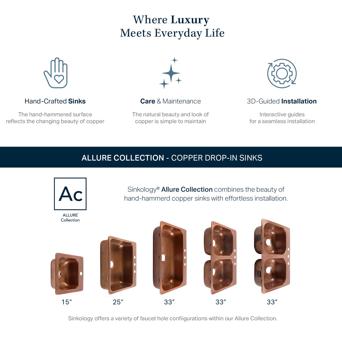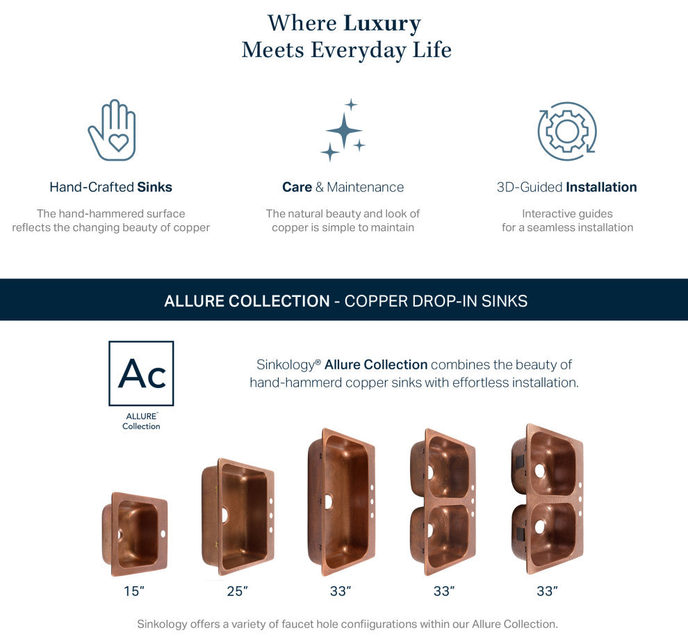 Just because you need to save space doesn''t mean you have to sacrifice style. The Angelico drop-in copper kitchen sink offers a space-saving design with a beautiful, timeless appeal. The single bowl ensures maximum workspace for washing dishes or prepping meals - even in smaller spaces. Our durable, solid copper sinks are hand-hammered by skilled craftsman and protected by our lifetime warranty.Dimensions: 25" x 22" x 8"Compact design is perfect for a small kitchen, home bar, laundry room, or tiny homeSingle bowl maximizes available spaceHand-hammered, solid 17-gauge copper is protected by our lifetime warrantySound dampening pads reduce dish clatter, noise, and vibrationsAntique Copper is aged to a medium-to-light tone for that classic copper lookNumber of pre-drilled faucet holes: 4Recommended Products: Venturi Kitchen Sink Bottom Grid in Antique Brown (#SG007-23)Kitchen Sink Basket Strainer Drain in Antique Copper (#TB35-01)Kitchen Sink Disposal Drain Flange in Antique Copper (#TD35-01)Copper Care IQ Kit (#SARMOR-101)