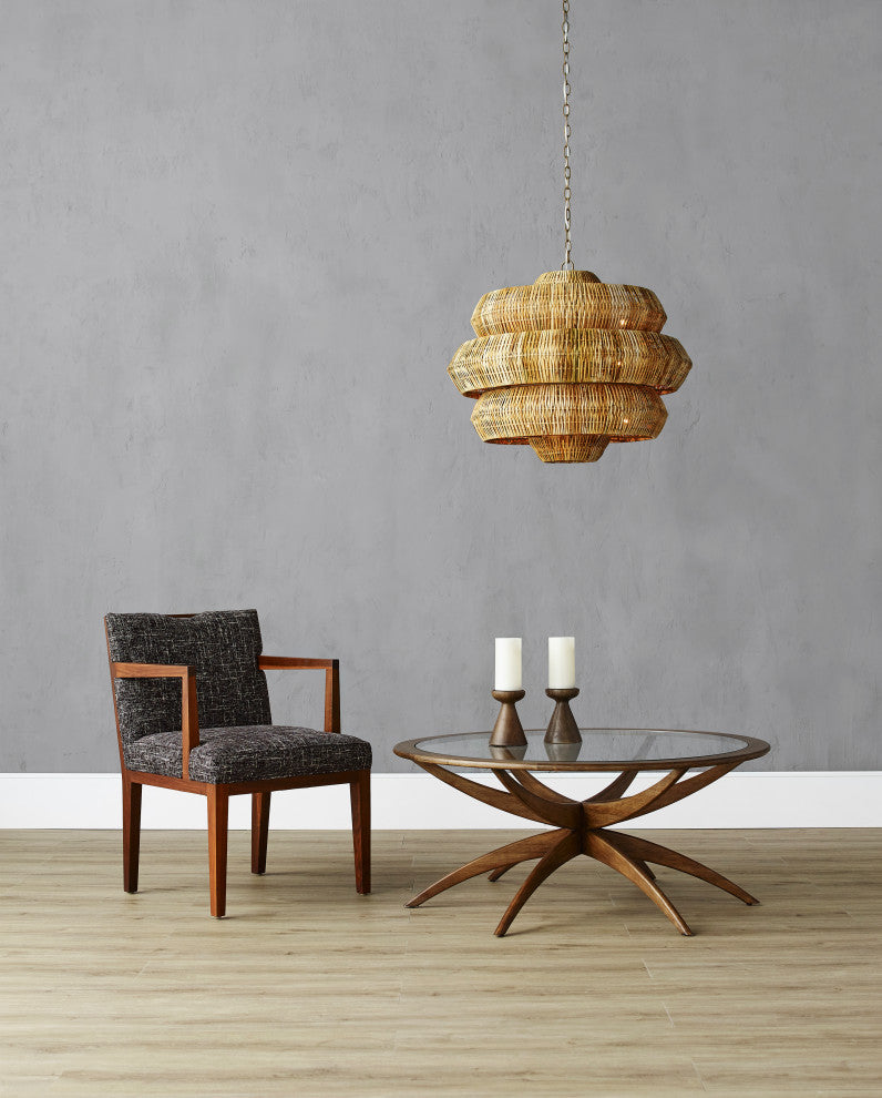 Painstakingly woven using traditional techniques, the Antibes Chandelier is an impeccable marriage of artistry and quality construction. Natural rattan forms the body of this geometric chandelier, supported by a Khaki wrought iron frame. This piece adds just a touch of worldly flavor into contemporary interiors.