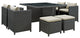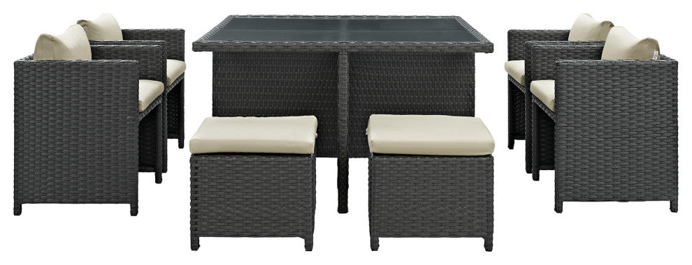 Outfit your patio with an imaginative outdoor sectional series of exceptional quality. The Sojourn series offers a robust seating experience that easily rearranges according to usage. Outfitted with industry-leading Sunbrella fabric cushions, synthetic rattan weave, UV protection, powder-coated aluminum frame, immensely enjoy your outdoor time with a series that enhances patio, backyard or poolside areas. This installment of the series is an Outdoor Patio Dining Set.Set Includes:Four - Sojourn Outdoor Wicker Patio ChairsFour - Sojourn Outdoor Wicker Patio StoolsOne - Sojourn Outdoor Wicker Patio Table Overall Product Dimensions: 101"L x 89"W x 30.5"HTable Dimensions: 52.5"L x 52.5"W x 29.5"HOttoman Dimensions: 19"L x 19"W x 14.5"HChair Dimensions: 22"L x 23.5"W x 26.5"HSeat Dimensions: 16.5"L x 21"W x 17"H Product Materials: rattan with Sunbrella fabric outer coverwaterproof nonwoven fabric inner coverPowder coated aluminum tube framewhite fabric grain tempered glassPolyester fiber for back cushion