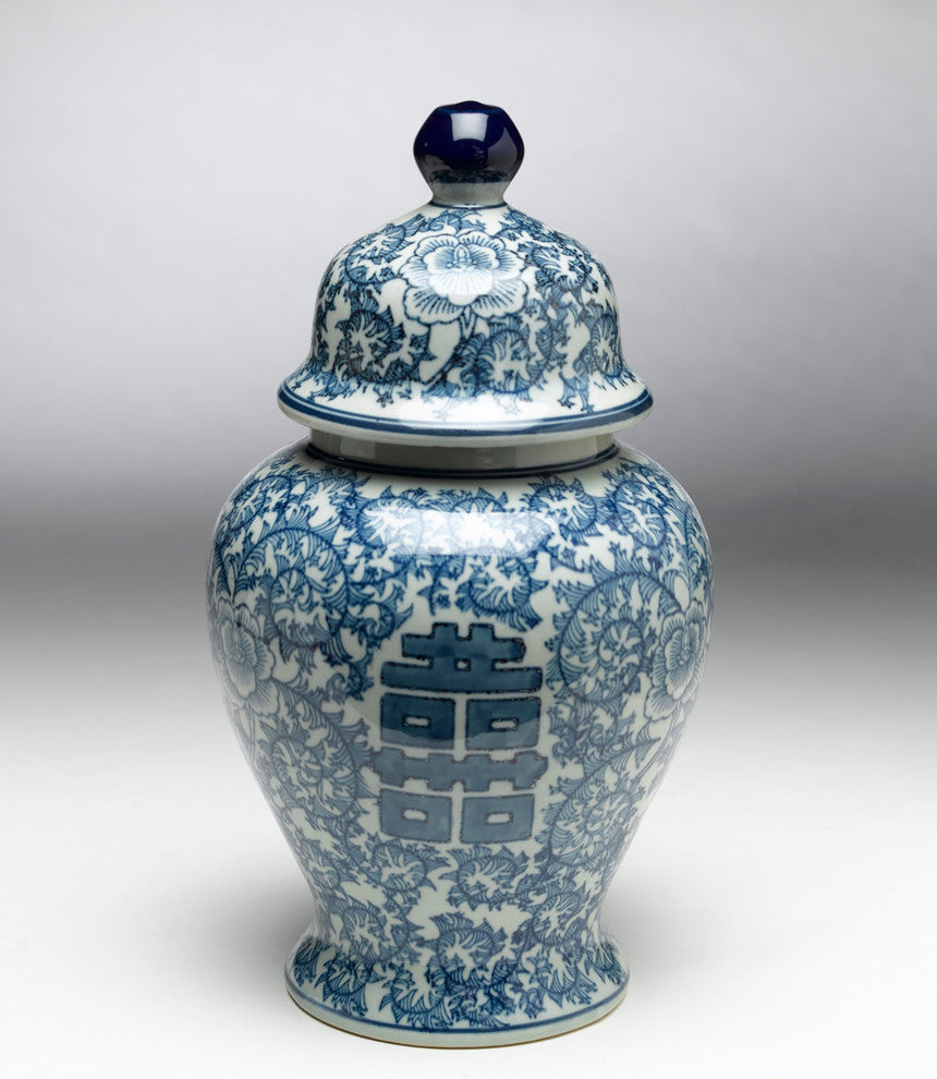 Antiqued pale green transferware porcelain with blue flower, leaf and vine design and Chinese symbol for double happiness. Lid is removable.
